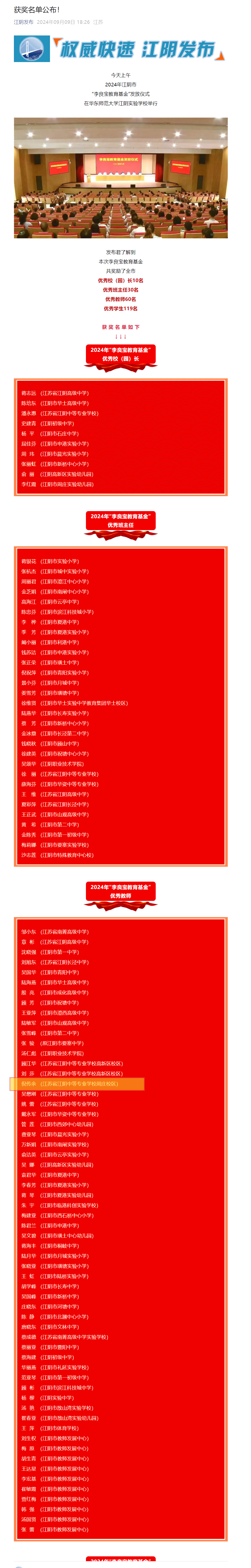 季春花名师工作室成员倪传余老师在2024年江阴市“李良宝教育基金”评选中被评为“优秀教师”