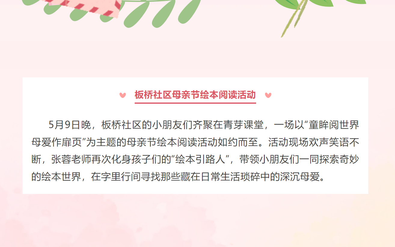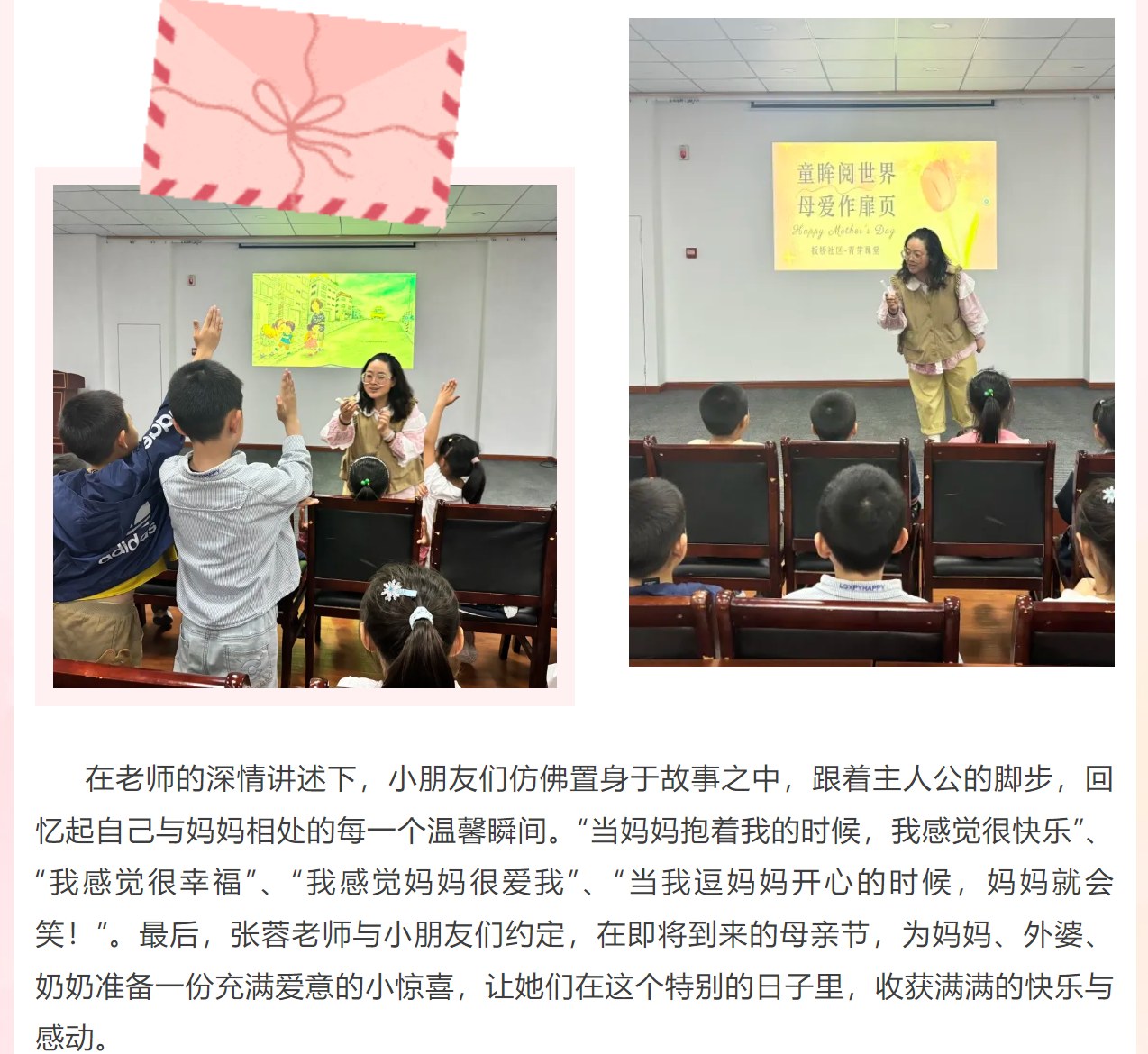 网站类目:专题讲座 活动级别:县级 活动类别: 执教姓名:张蓉 所在单位:江苏省江阴中等专业学校高新区校区 执教时间:2025-05-09 执教地点:板桥社区 执教内容:童眸阅世界 母爱作扉页 参加对象:板桥社区儿童和工作人员