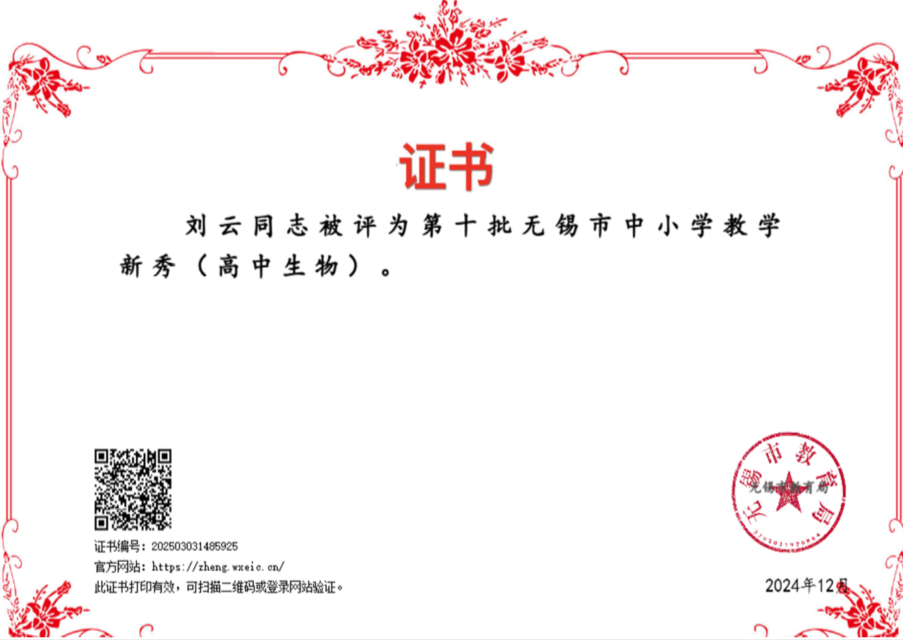 网站类目:荣誉提升情况 姓名:刘云 所在单位:江阴市教育局 荣誉类别:新秀 荣誉级别:市级 获得时间:2024-12-26 评比部门:无锡市教育局
