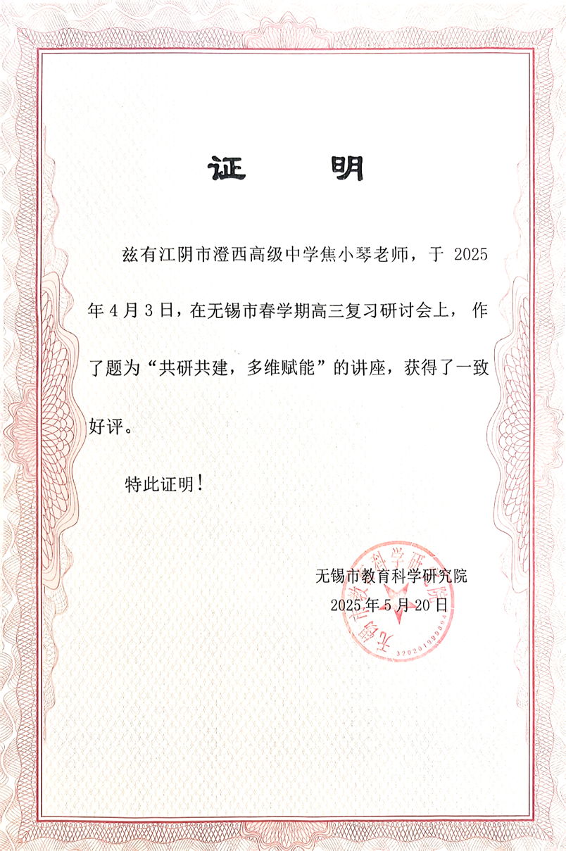 网站类目:专题讲座 活动级别:市级 活动类别: 执教姓名:焦小琴 所在单位:江阴市澄西高级中学 执教时间:2025-05-20 执教地点:江阴市第一中学 执教内容:高三复习研讨会 参加对象:无锡市高三生物老师