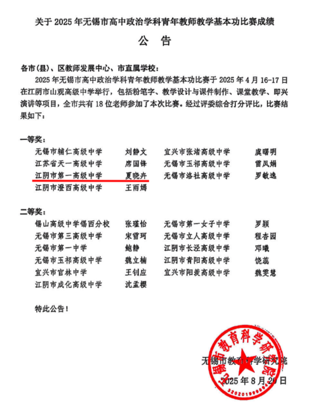 杨晓丽高中政治名师工作室成员无锡基本功一等奖 2025-10-10