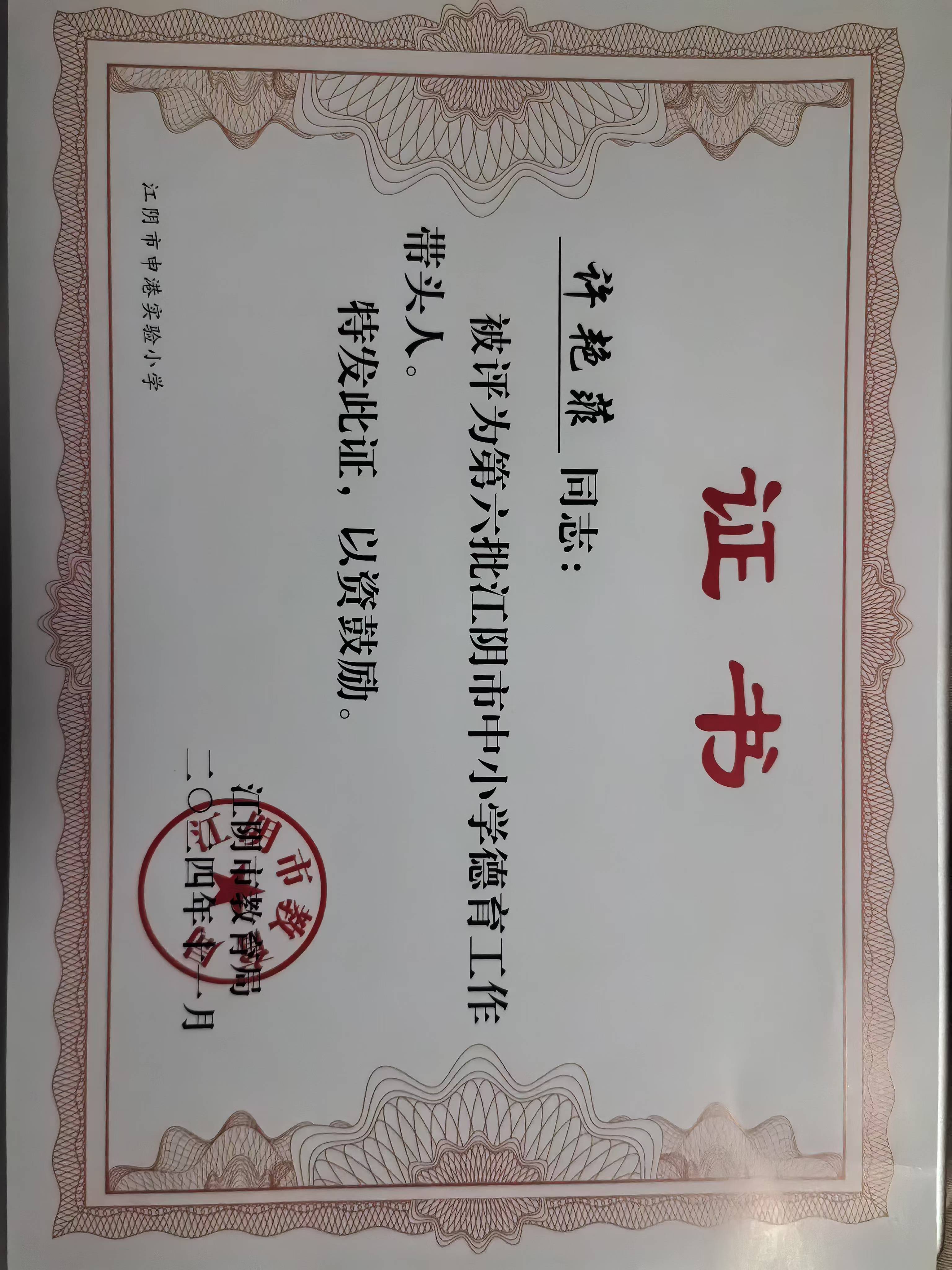 行政表彰21:沈晔名师工作室许艳菲获评“第六批江阴市中小学德育工作带头人”