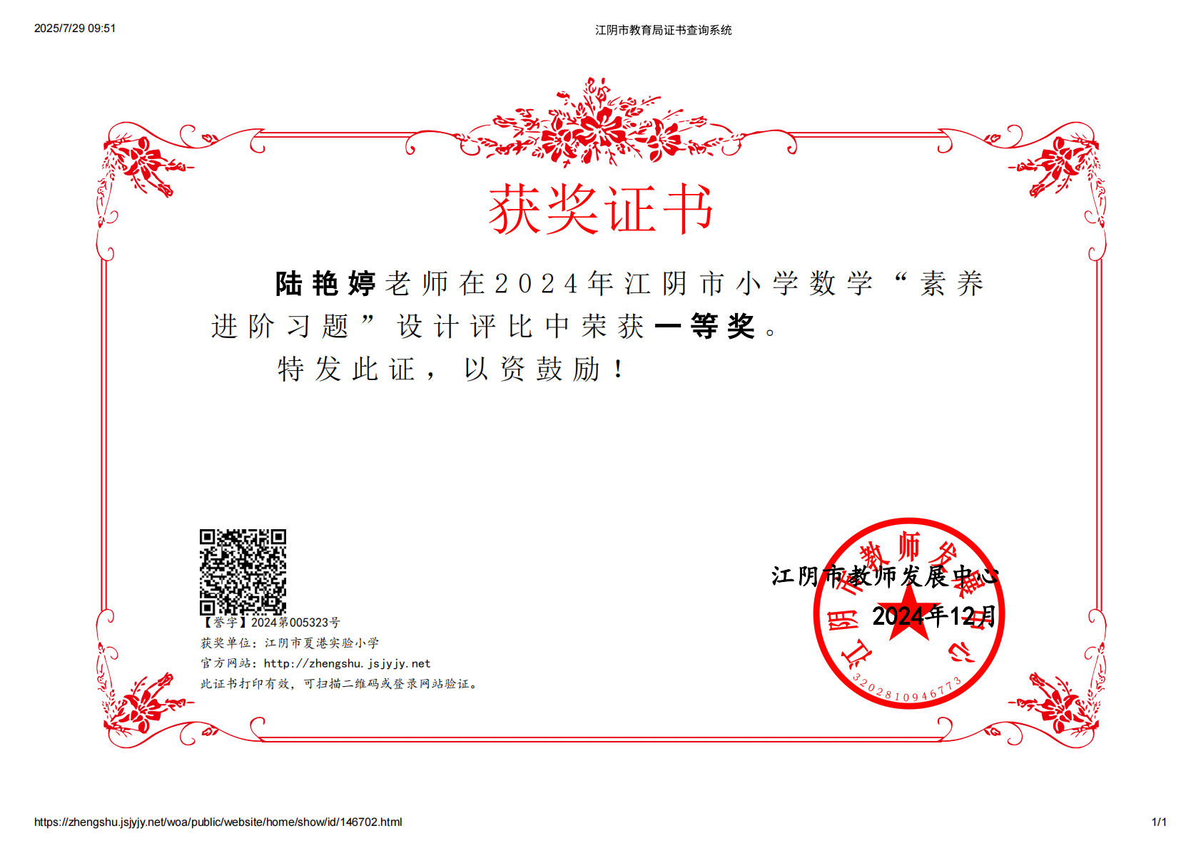 网站类目:学科比赛情况 姓名:陆艳婷 所在单位:江阴市夏港实验小学 获奖类别:教学比赛 获奖级别:县级 获奖等级: 获奖时间:2024-12-06 评比部门:江阴市教师发展中心 发表刊物: 刊物级别:国家级 发表时间:2025-10-14