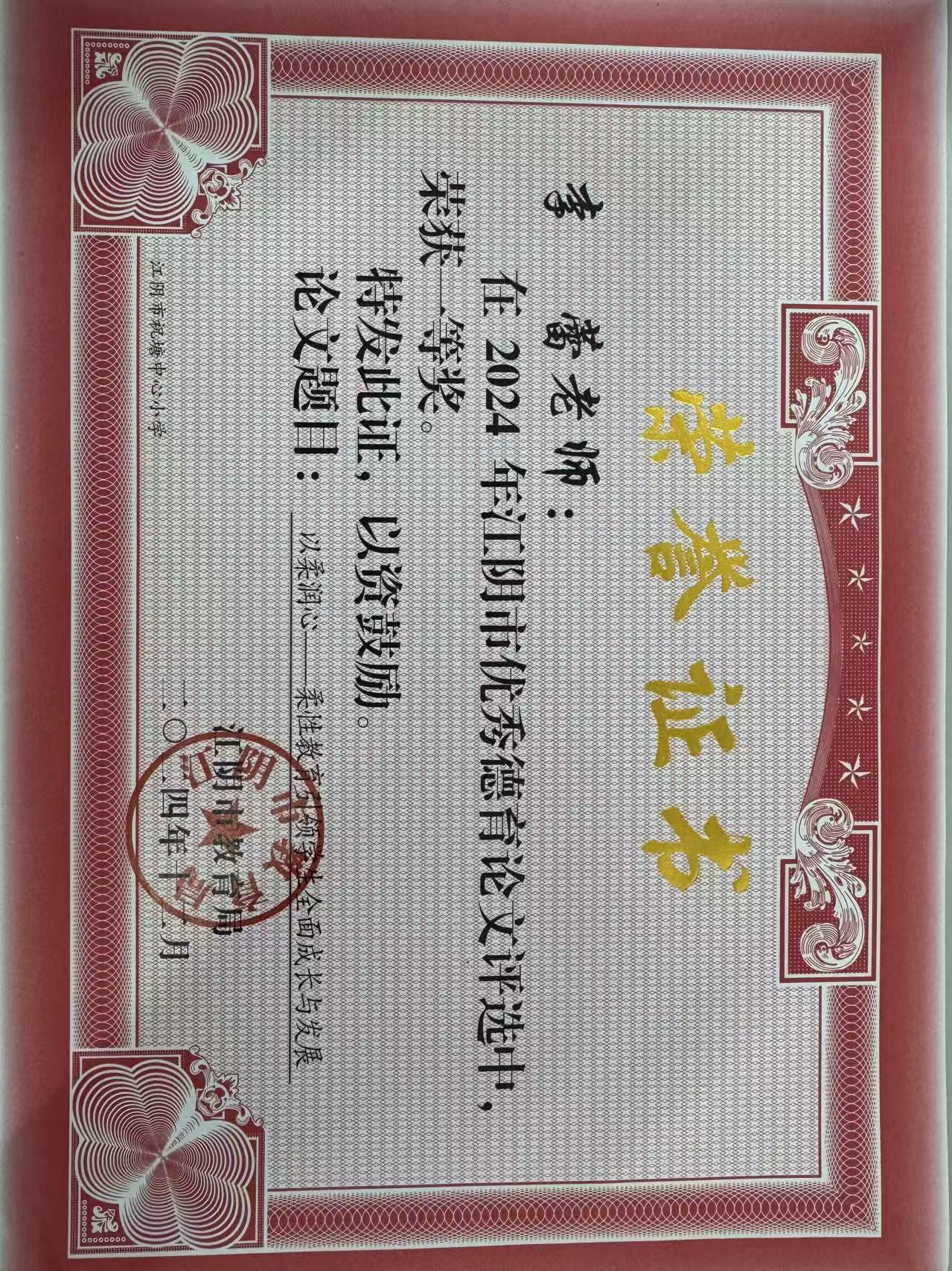 2024年李蕾获得江阴市优秀德育论文一等奖
