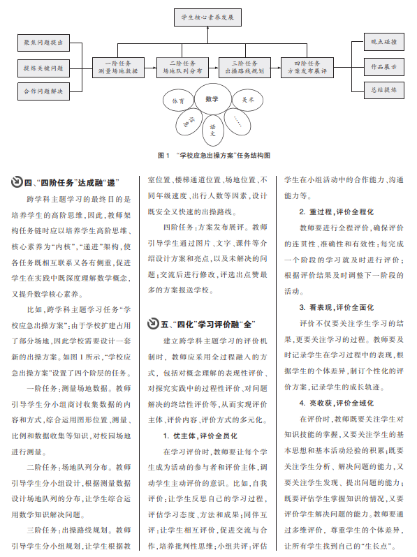 该研究不仅提供了丰富的教学设计示例(如测量场地数据、路线规划等),还强调了评价的全过程融入,适合一线教师参考以提升跨学科教学的实效性,推荐给从事小学数学教研工作的读者。