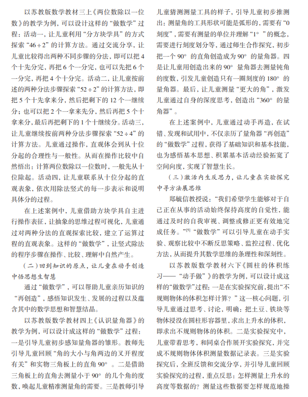 推荐理由: 这篇论文深入探讨了“做数学”的内涵与价值,主张通过操作体验、动手创造、实验探究和综合实践等具身学习方式,破解数学抽象性带来的教学困境。作者乔海兵基于“做中学”理论,分析了“做数学”在促进学科育人、改进教学方式和实现深度学习方面的作用,并提供了多元表征建关联、回到知识原点等实践策略(如《两位数除以一位数》教学案例)。论文突出强调了手脑协同对数学思维发展的必要性,对于推动数学教育从知识灌输向素养培育转型具有启发意义,特别推荐给关注探究式教学和核心素养落地的教育工作者。