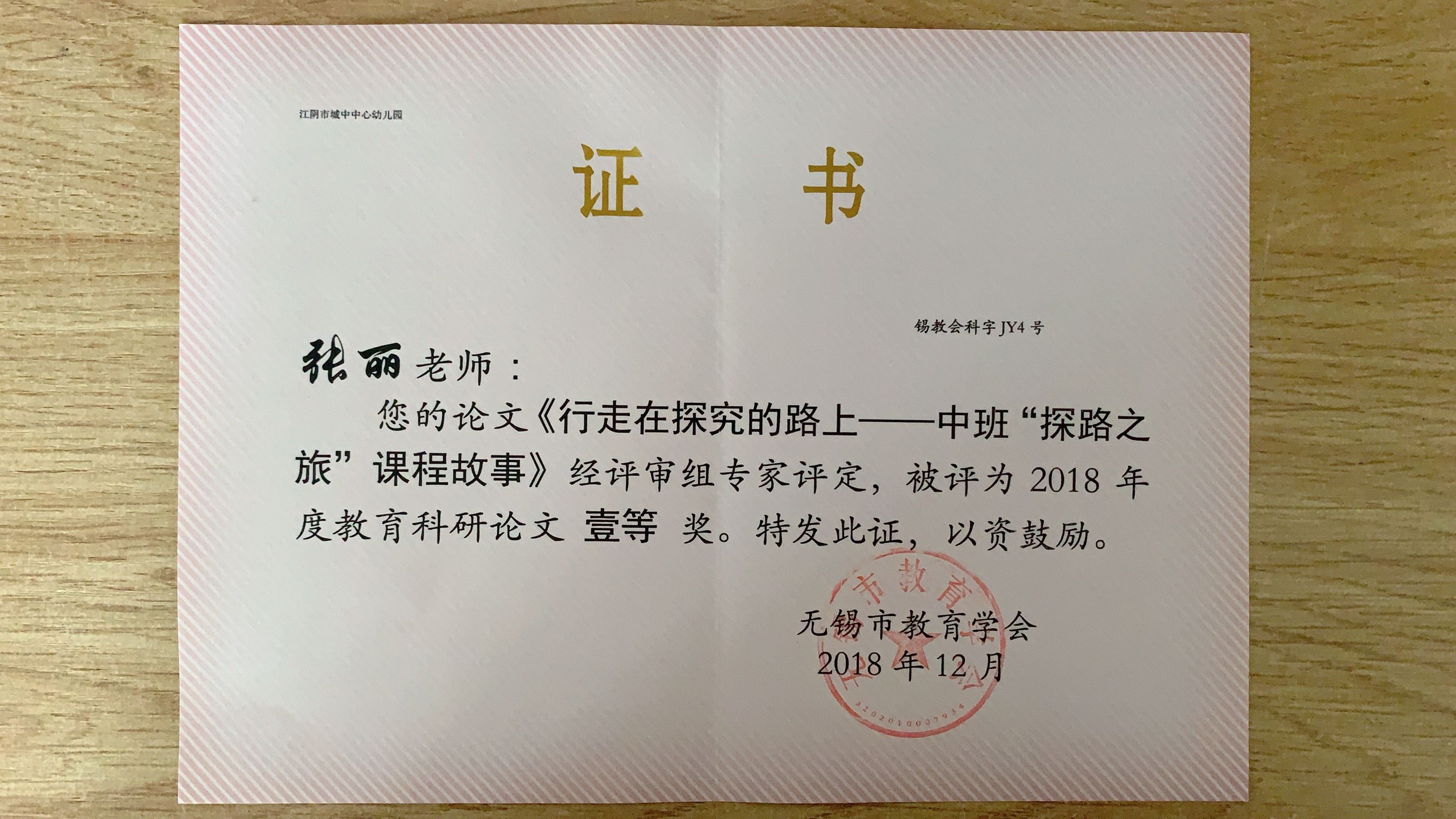张丽老师论文《行走在探究的路上》获无锡市科研论文一等奖