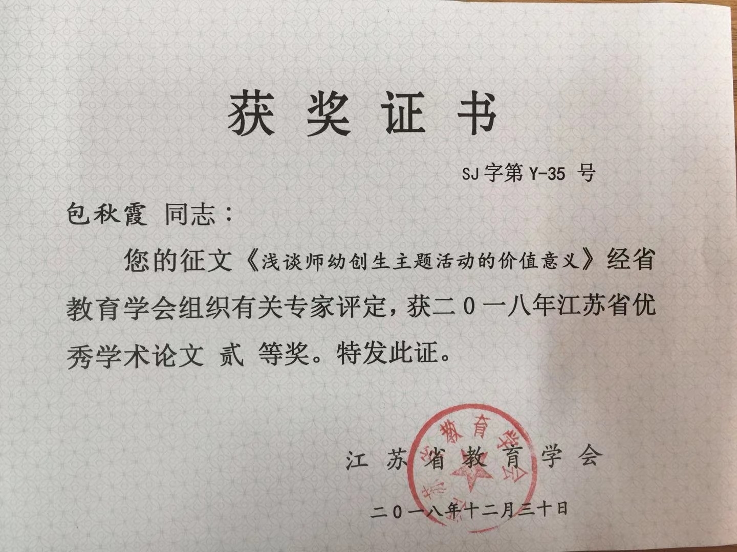 包秋霞老师的论文《浅谈师幼创生主题活动的价值意义》获江苏省优秀学术论文二等奖