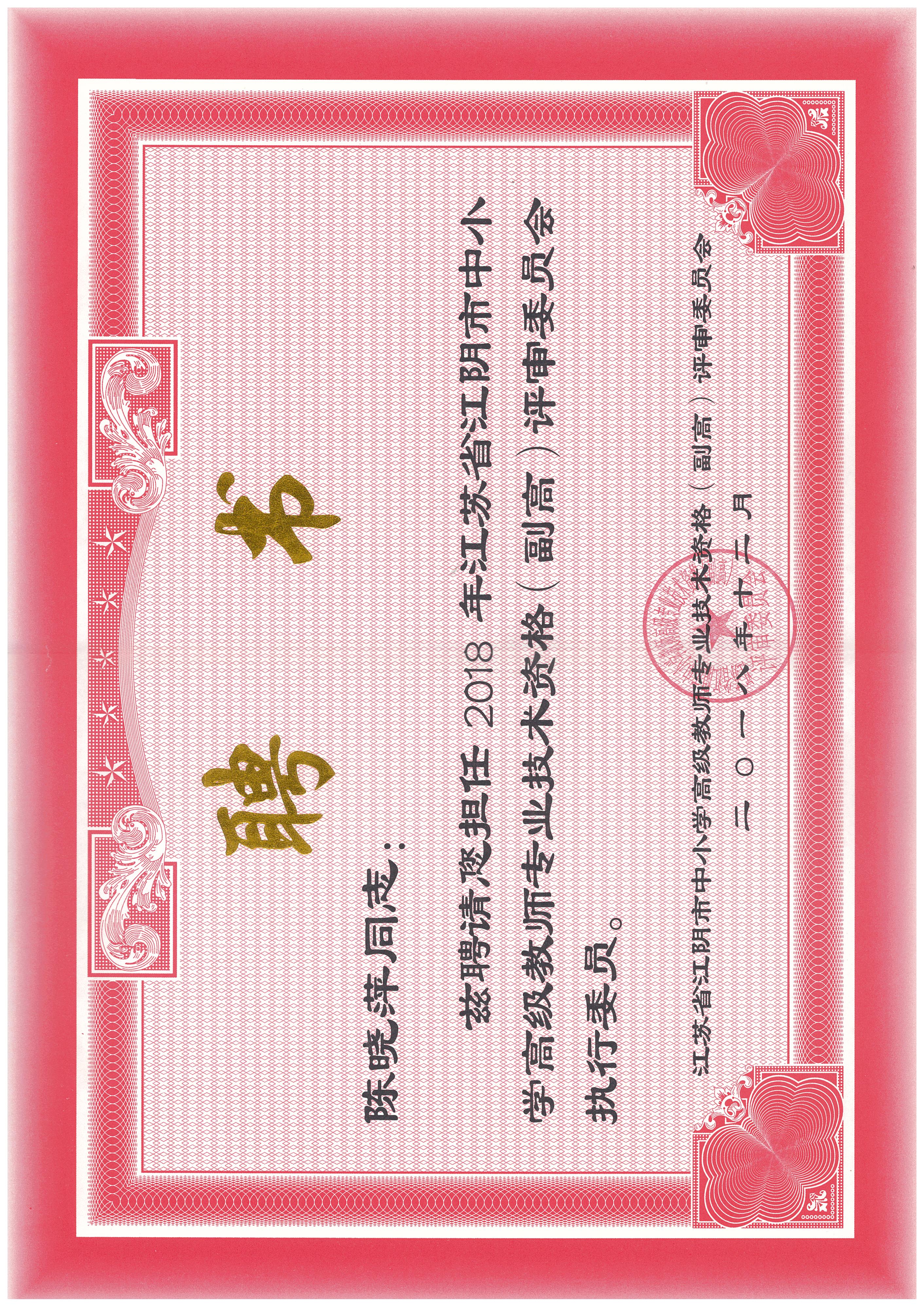 陈晓萍任江阴副高评审聘书 2019-07-22