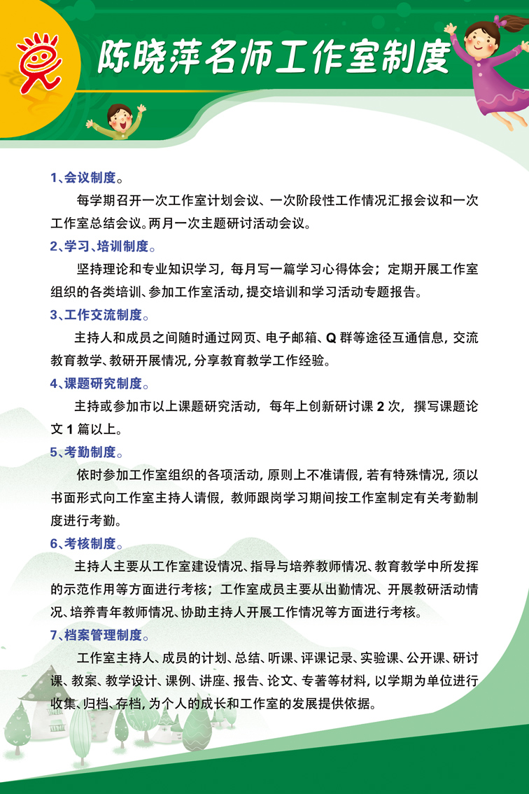 7、档案管理制度。工作室主持人、成员的计划、总结、听课、评课记录、实验课、公开课、研讨课、教案、教学设计、课例、讲座、报告、论文、专著等材料,以学期为单位进行收集、归档、存档,为个人的成长和工作室的发展提供依据。