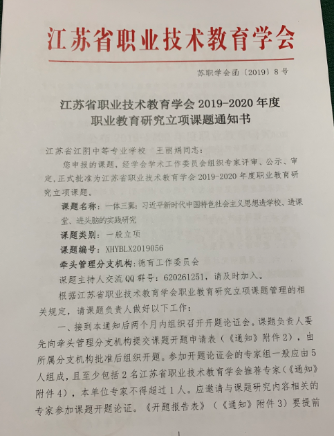 2019年6月,王丽娟老师申报的《一体三翼,习近平新时代中国特色社会主义思想进教材、进课堂、进头脑》被批准为江苏省职业技术教育学会2019-2020年职业教育研究课题