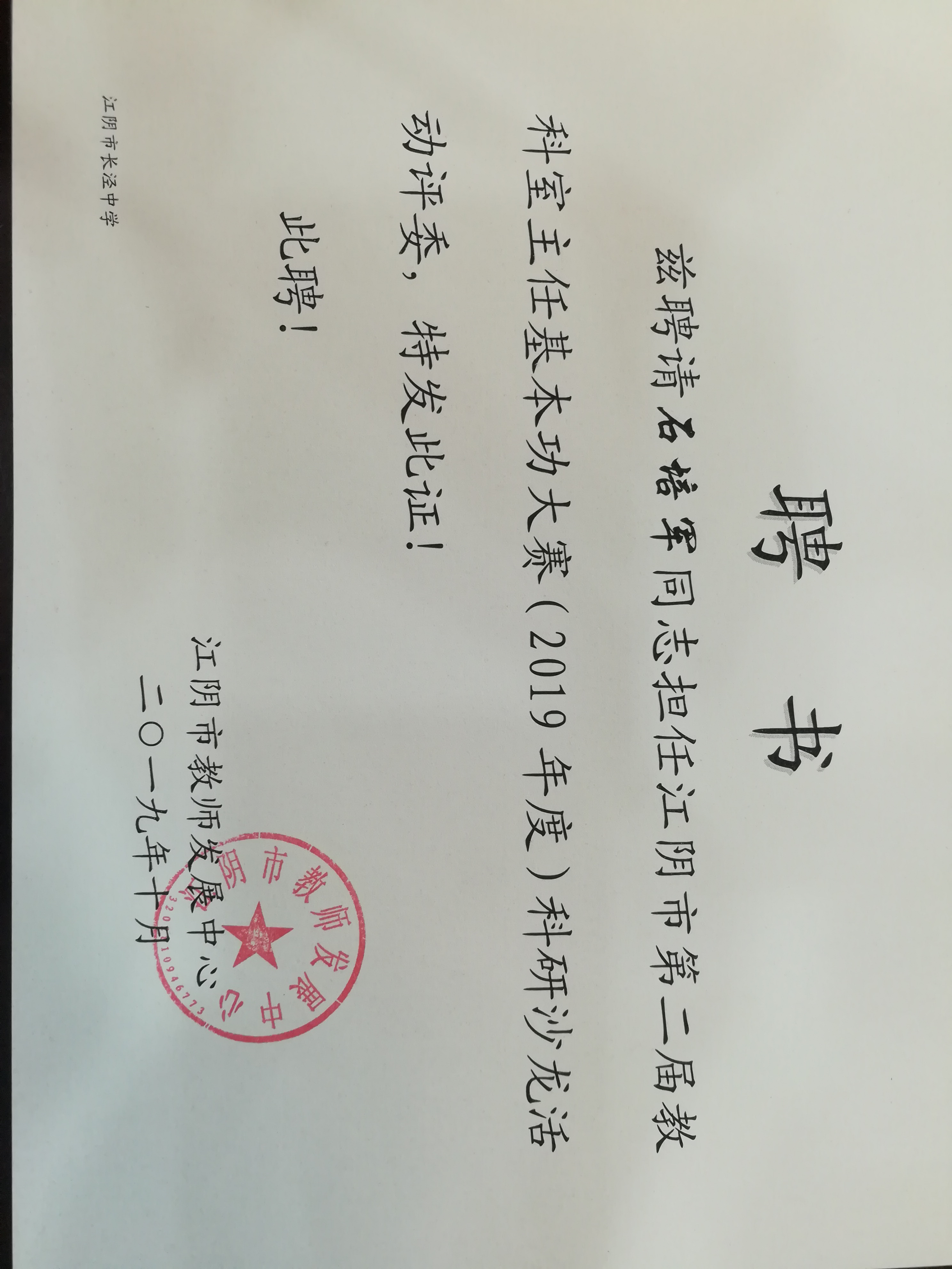 石培军老师被聘为2019年江阴市教科室主任评委会委员