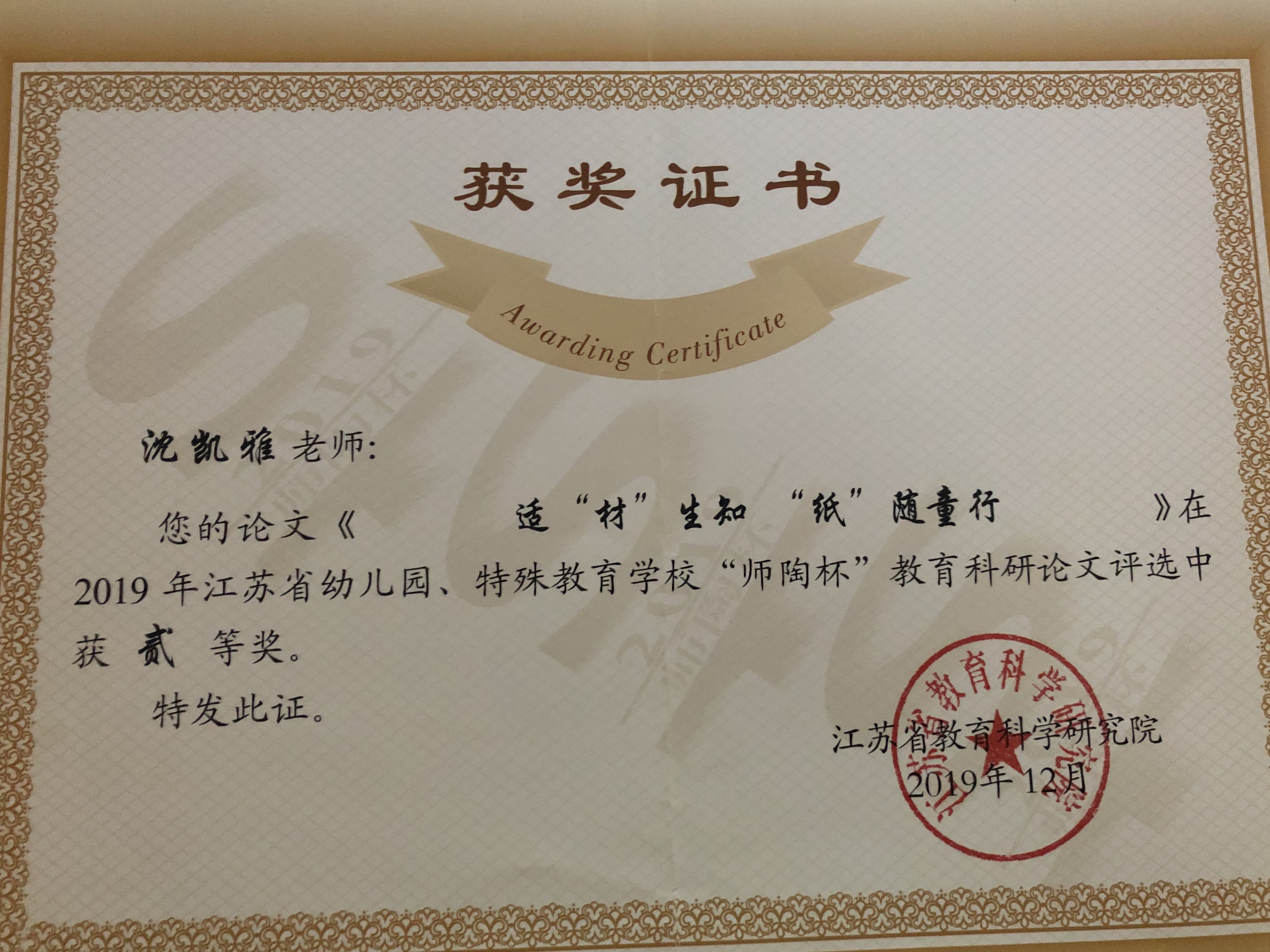 沈凯雅老师的论文《适“材”生知,“纸”随童行》获江苏省师陶杯二等奖