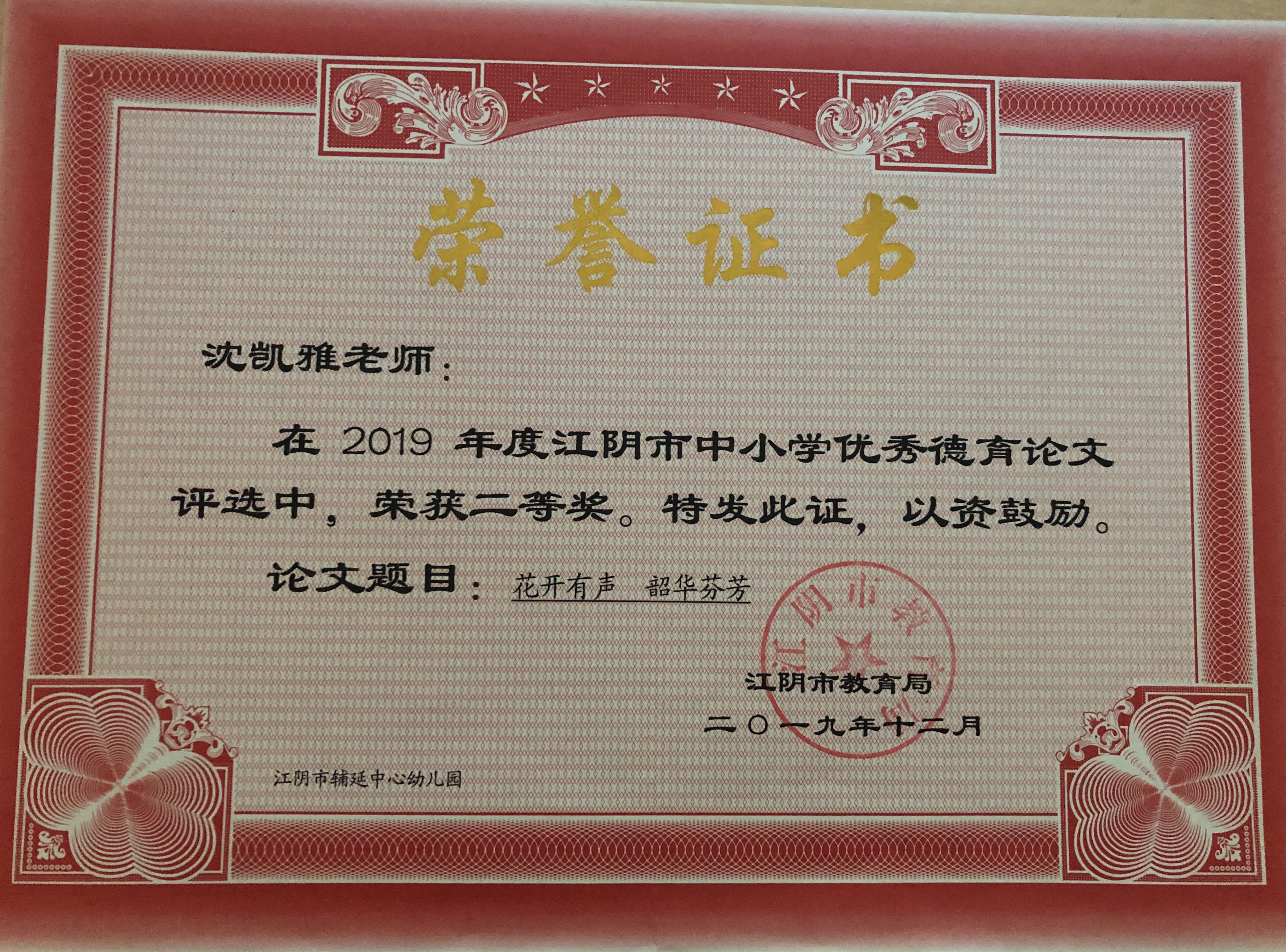 沈凯雅老师的论文《花开有声 韶华芬芳》获江阴市中小学优秀德育论文二等奖