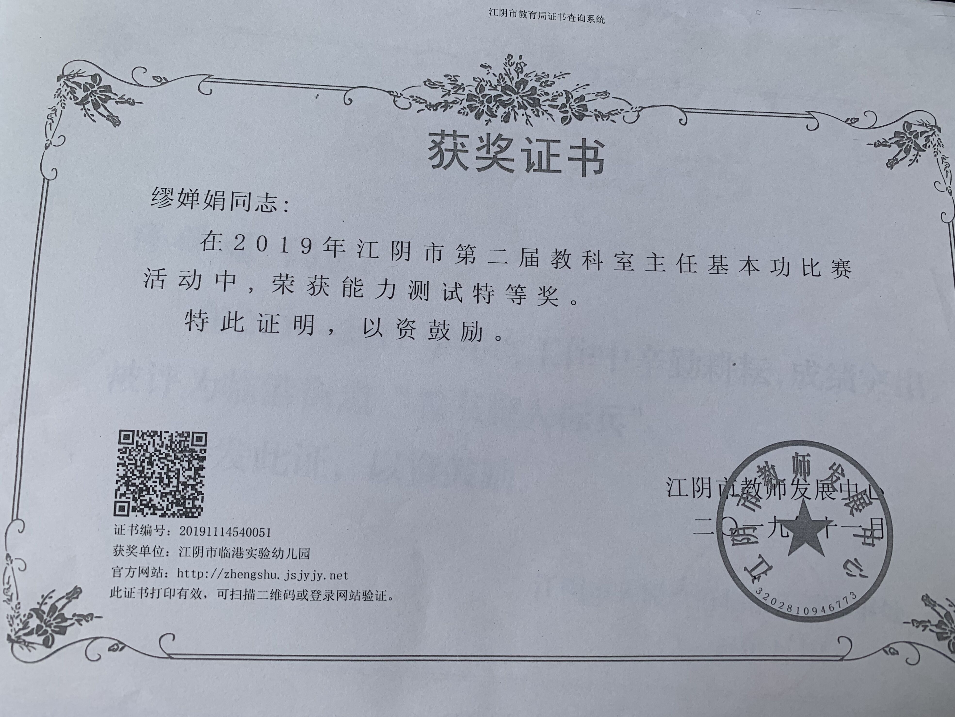 缪婵娟老师在江阴市第二届教科室主任基本功大赛比赛中荣获能力测试特等奖