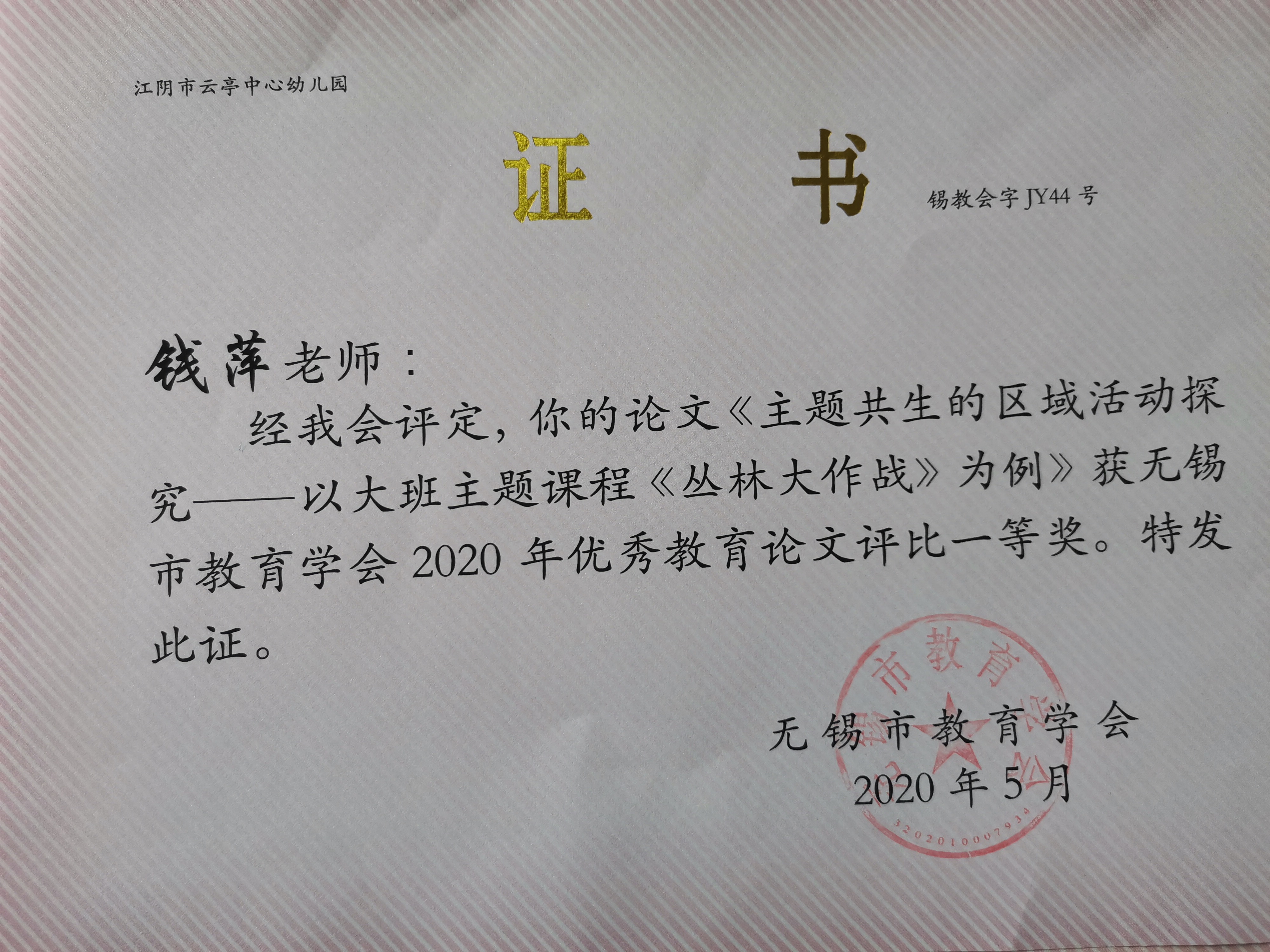 钱萍老师论文《主题共生的区域活动探究》获无锡市一等奖