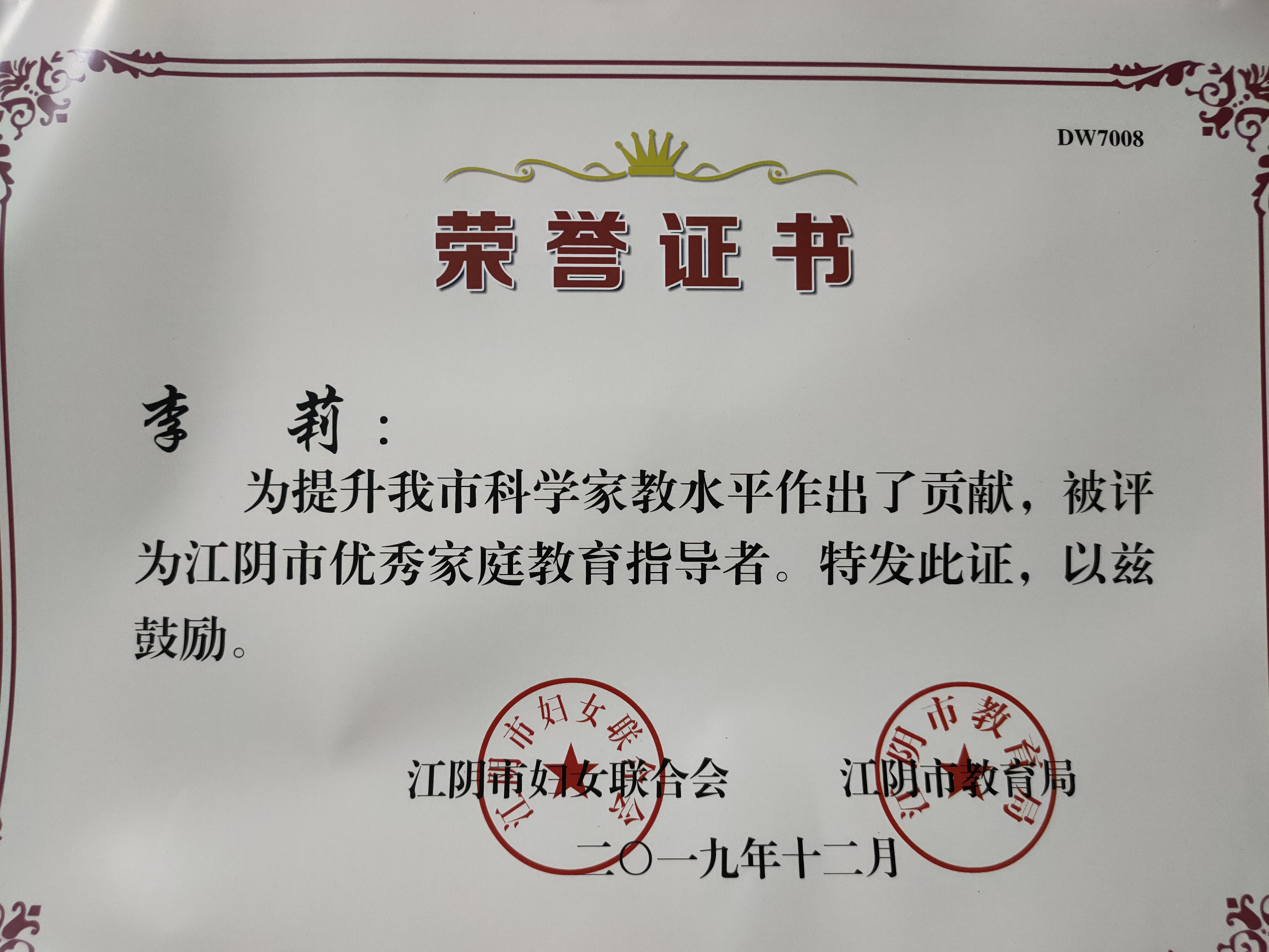 李莉老师被评为江阴市优秀家庭教育指导者