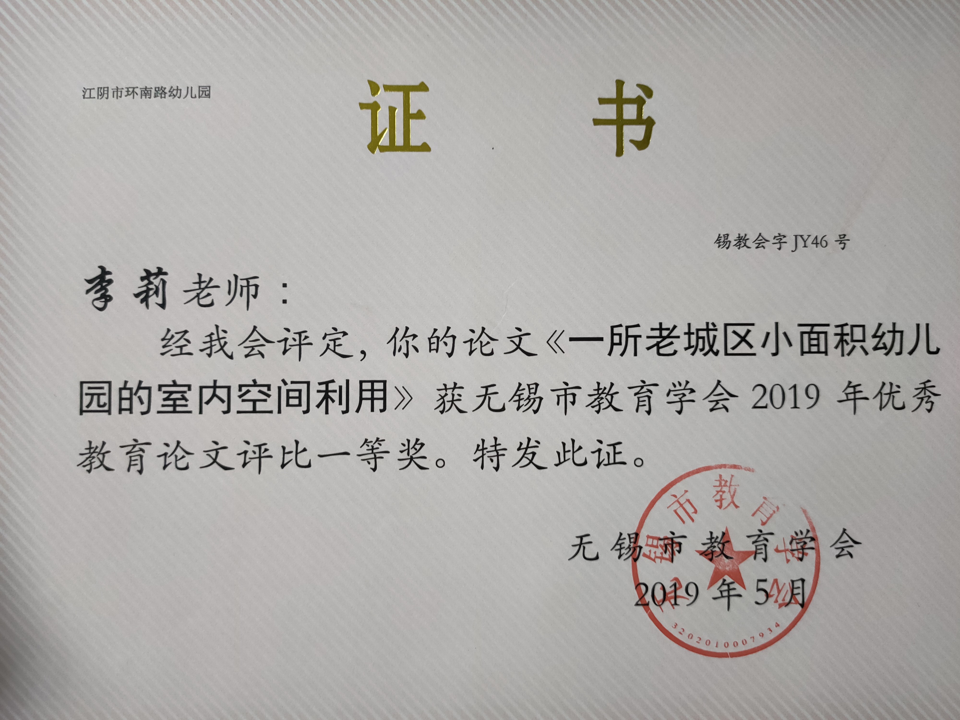李莉老师论文《一所老城区小面积幼儿园的室内空间利用》无锡市教育学会一等奖