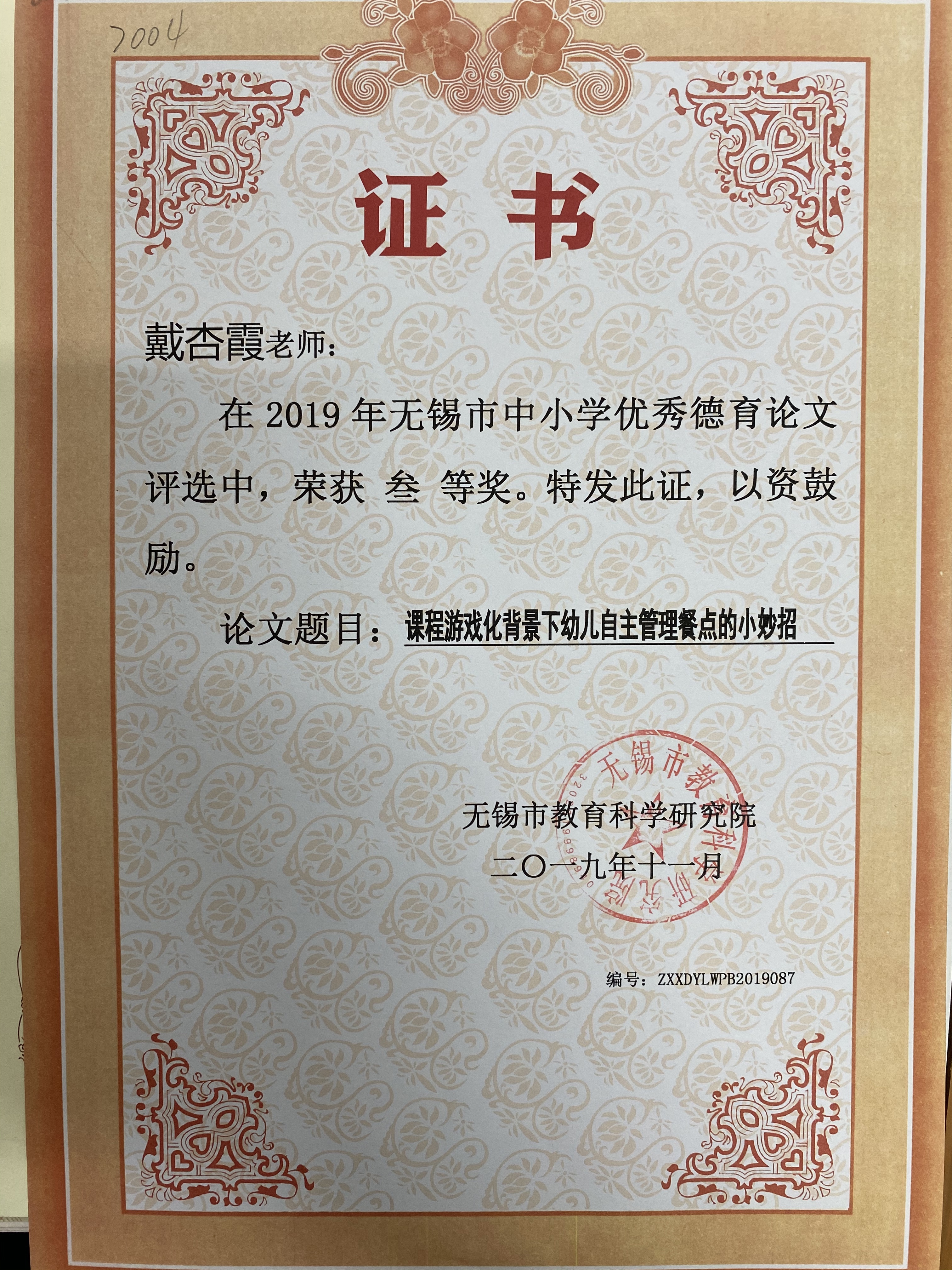 戴杏霞老师的论文《课程游戏化背景下幼儿自主管理餐点小妙招》获2019年无锡市中小学优秀德育论文三等奖
