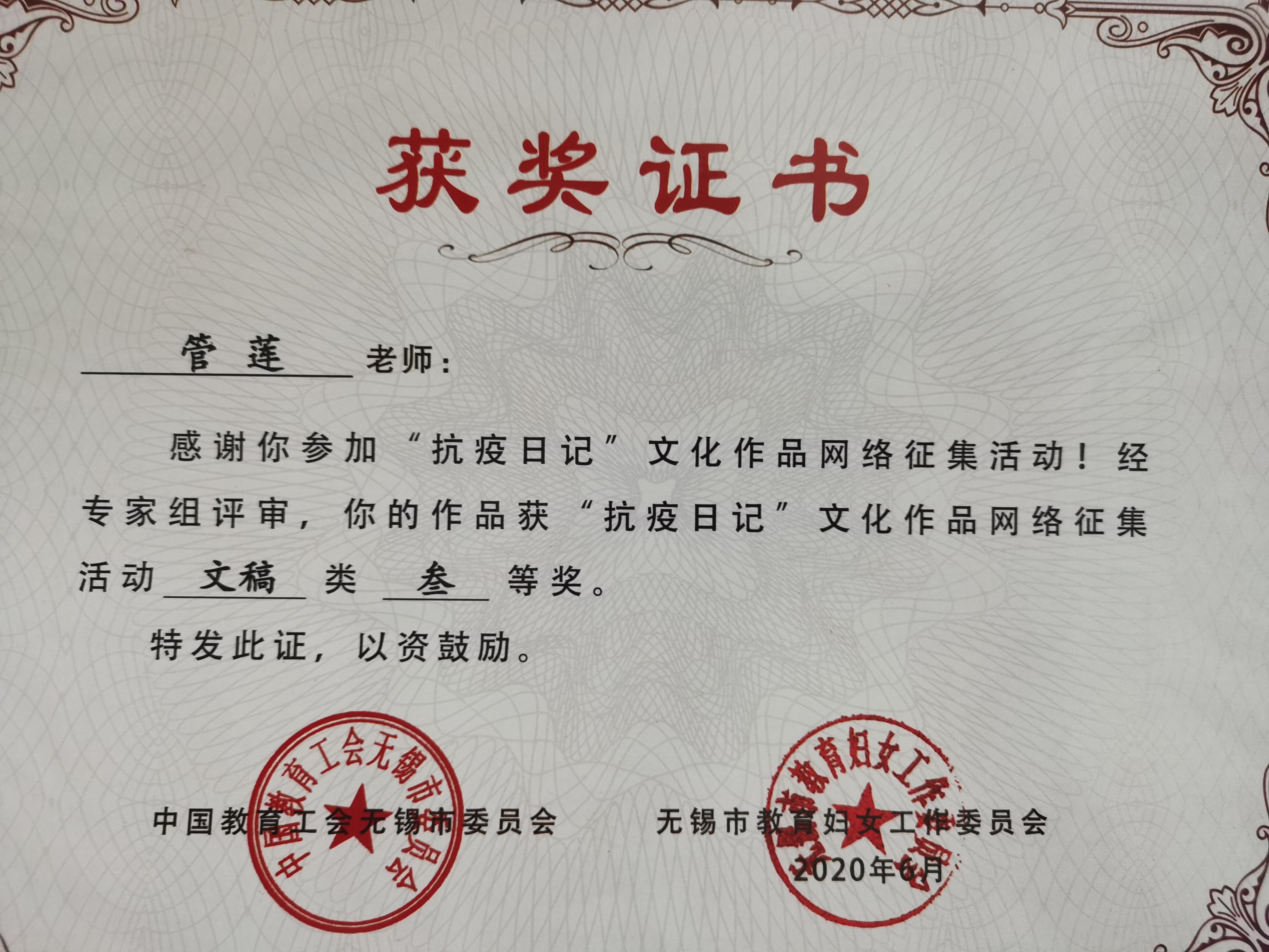 管莲 “抗疫日记”文稿类获无锡市三等奖