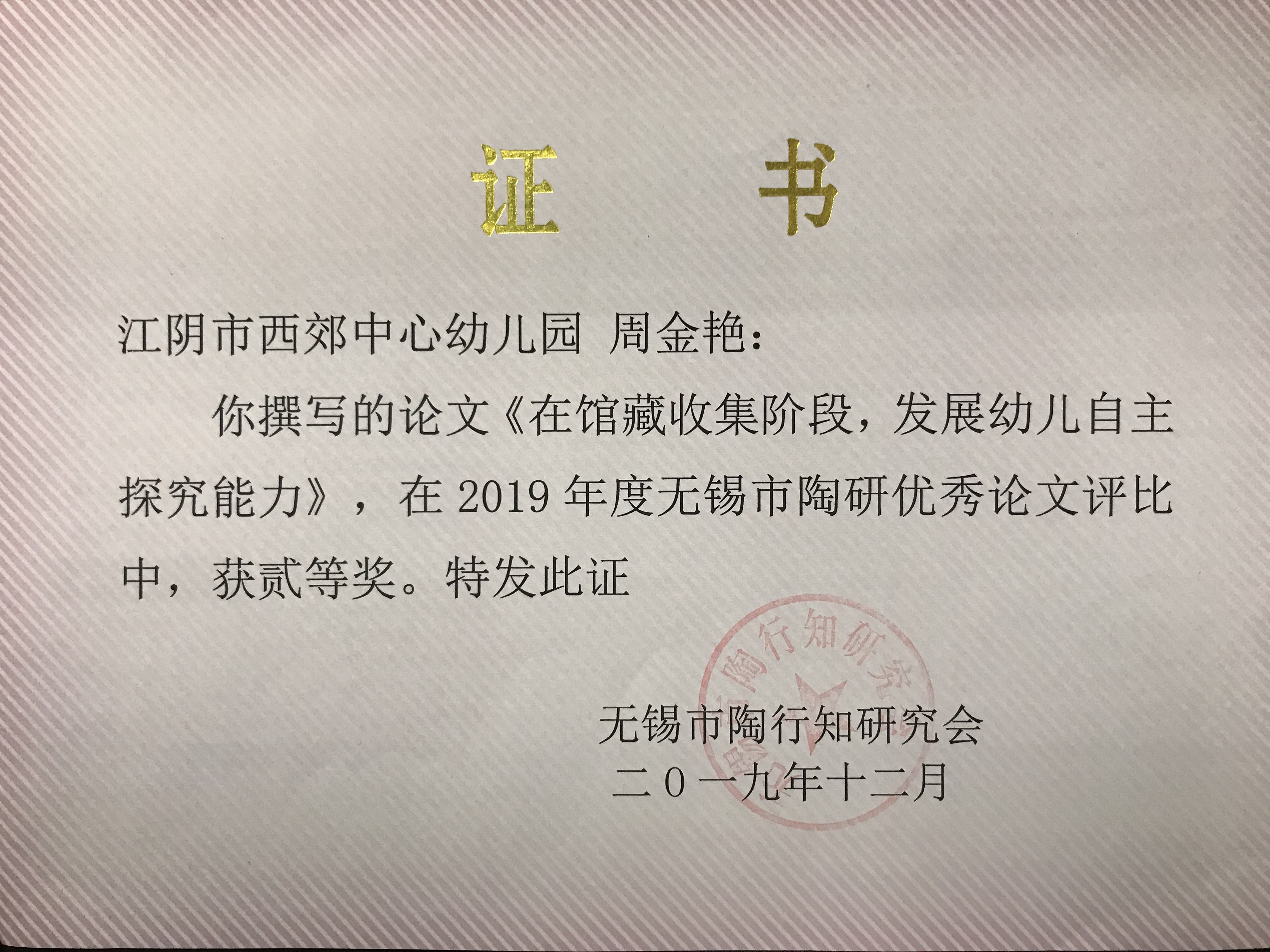 周金艳老师《在馆藏收集阶段,发展幼儿自主探究能力》获无锡市二等奖