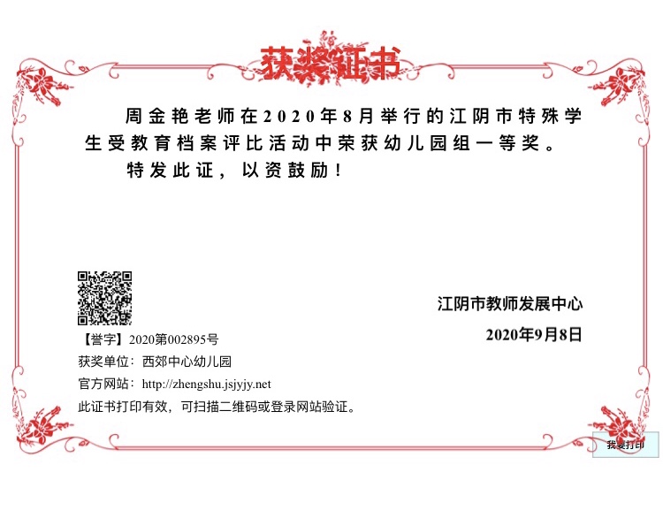 周金艳老师在江阴市特殊学生受教育档案评比活动中获一等奖
