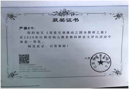 严瑛老师论文《寻觅引领推动之园本教研之旅》获得江阴市幼儿教育教科研论文一等奖