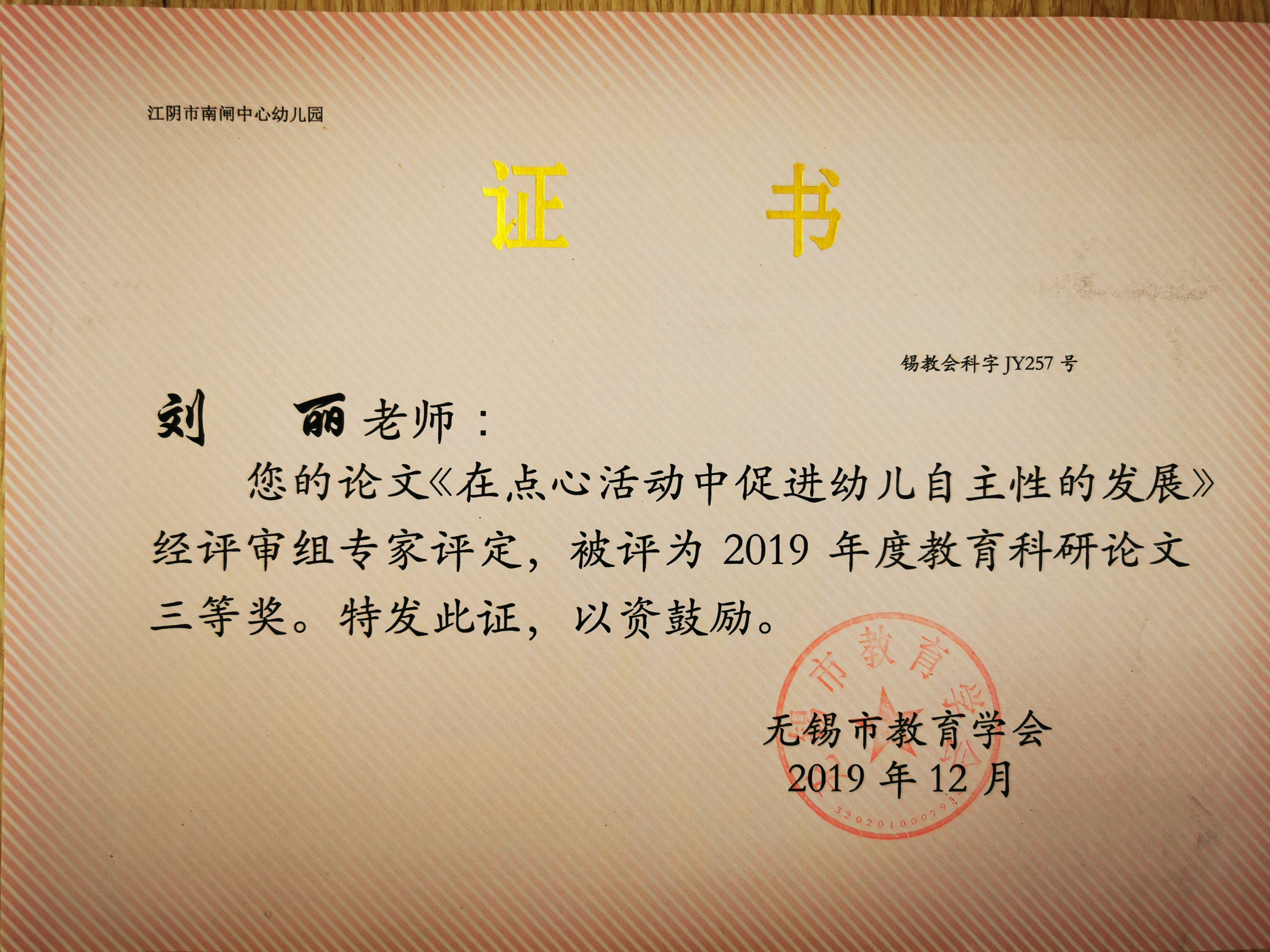刘丽《在点心活动中促进幼儿自主性的发展》获无锡市教育学会教育科研论文三等奖