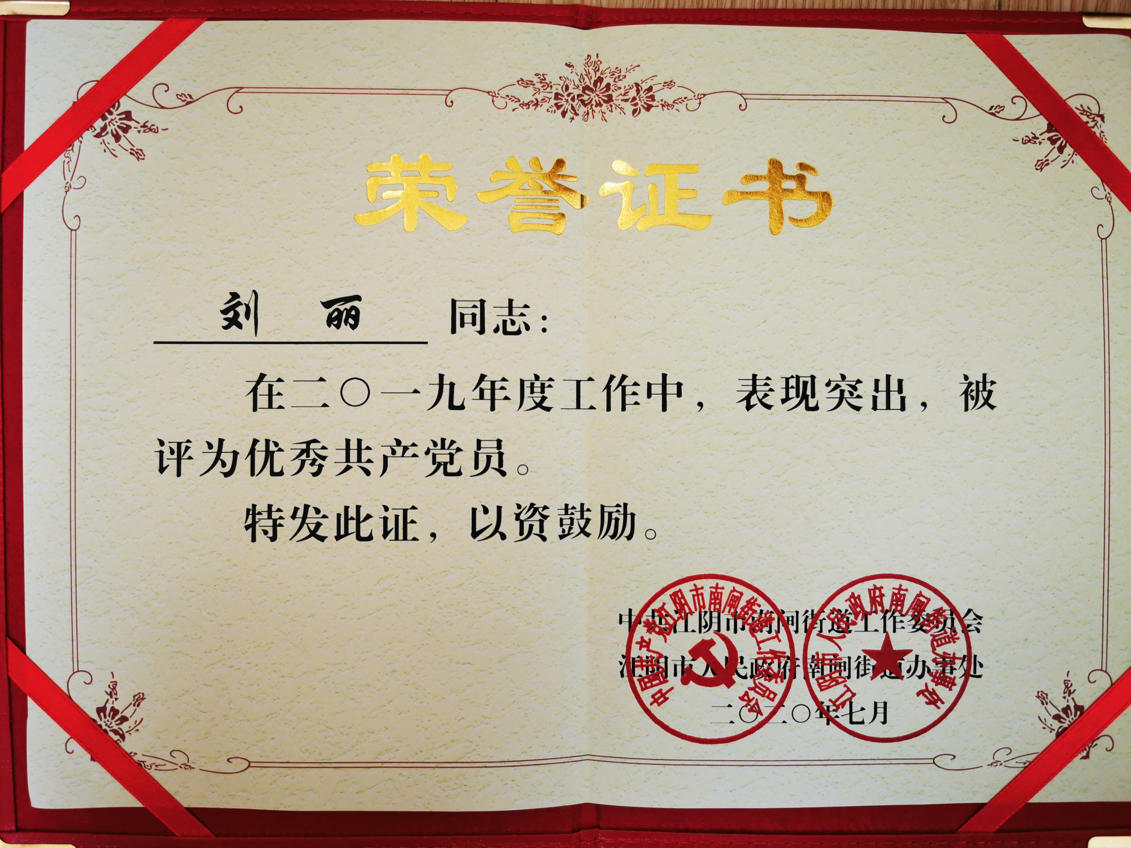 刘丽在2019年度工作中被评为“优秀共产党员”