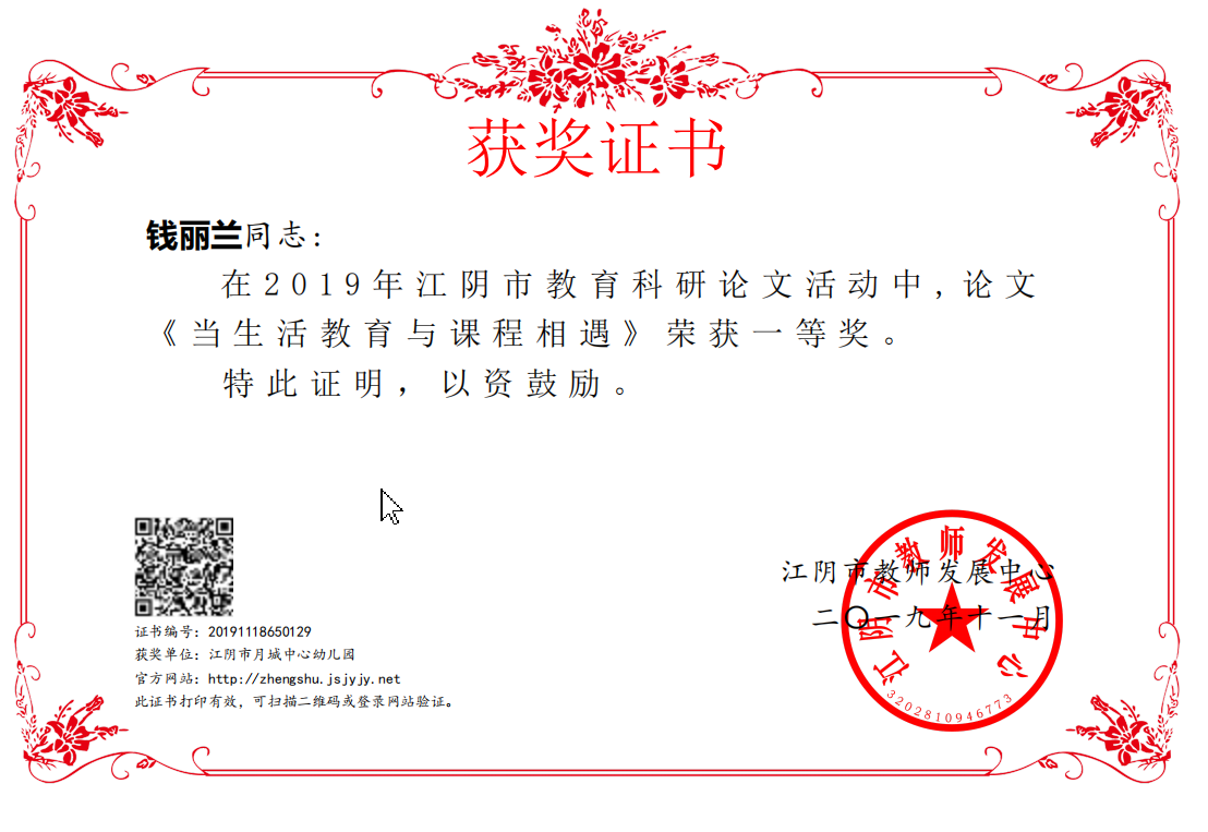 钱丽兰老师论文《当生活教育与课程相遇》获江阴市教育科研论文一等奖