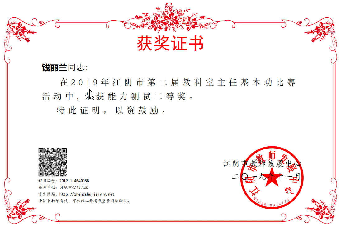 钱丽兰老师在江阴市第二届教科室主任基本功比赛中荣获能力测试二等奖