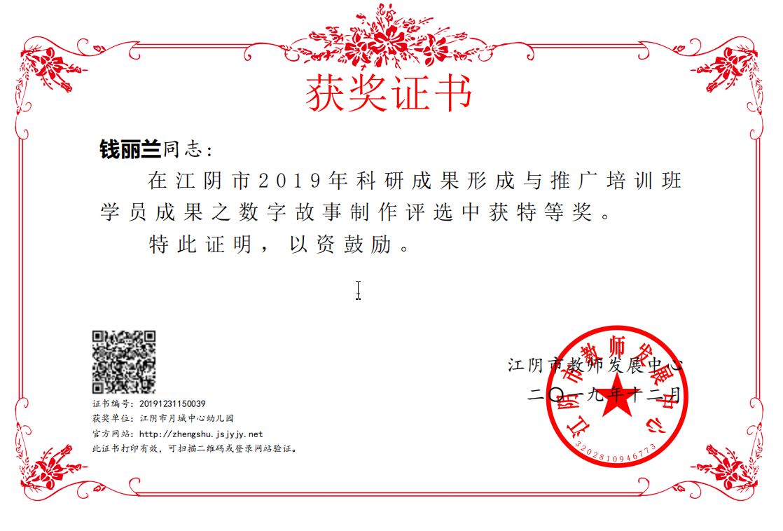 钱丽兰老师在江阴市科研成果形成与推广培训班故事制作评选中获特等奖