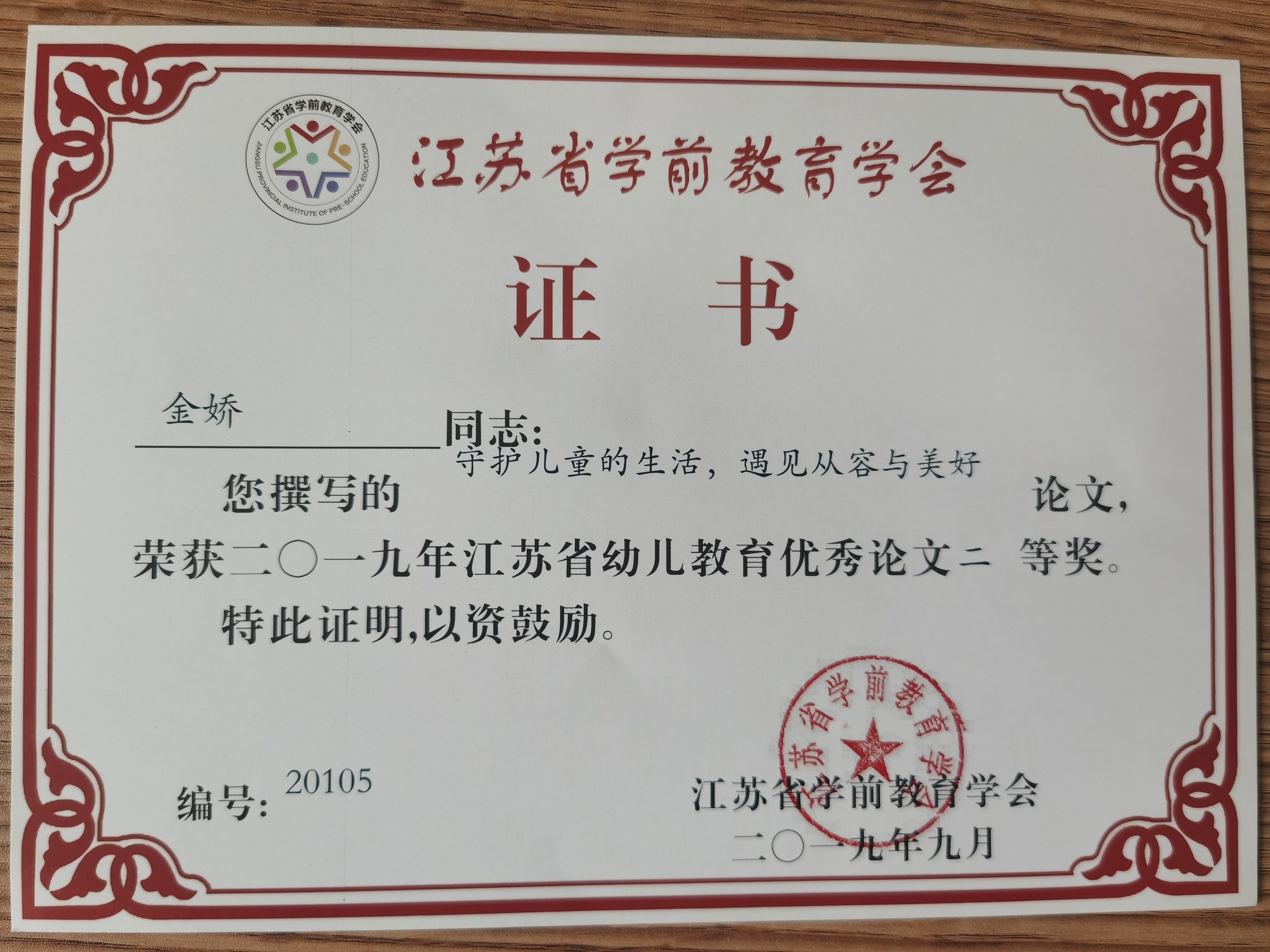 金娇老师论文《守护儿童的生活,遇见从容与美好》获江苏省学前教育学会二等奖