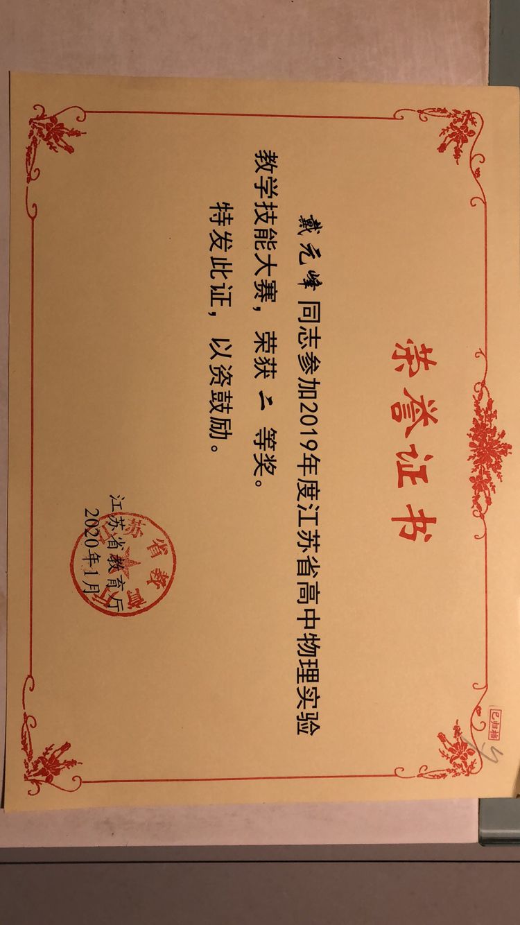 戴元峰老师荣获江苏省实验操作大赛二等奖第一名。
