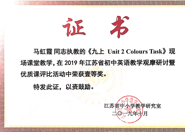 马虹霞老师执教的《九上Unit 2 Colours Task》获获江苏省英语教学优质课评比一等奖 2020-10-10