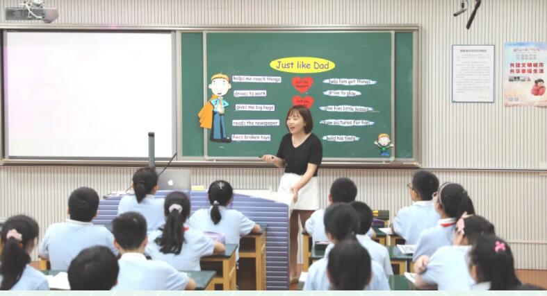 邵蓉老师给五年级的学生带来了暖心绘本课Just like Dad。邵老师关注学生情感,通过多种形式,引导学生观察绘本图片,理清绘本逻辑,抓住绘本内涵,感受故事中父与子之间的融洽幸福,鼓励学生联系生活,运用所学语言表达自身情感。