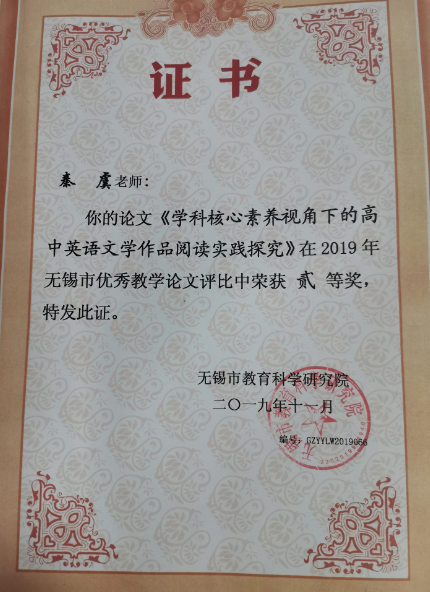 《学科核心素养视角下的高中英语文学作品阅读实践研究》获无锡市优秀教学论文评比二等奖