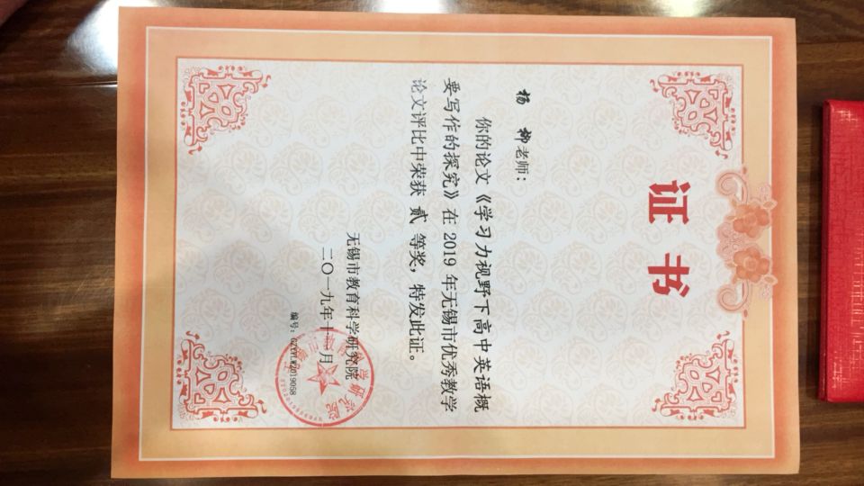 《学习力视野下高中英语概要写作的探究》获无锡市教育科学研究院举办的无锡市优秀教学论文评比中获二等奖。