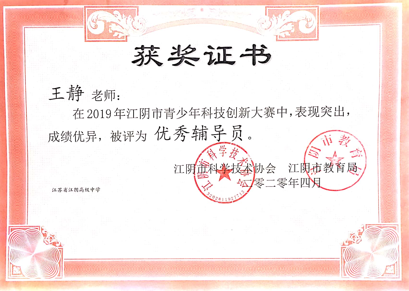 王静被评为青少年科技创新大赛优秀辅导员