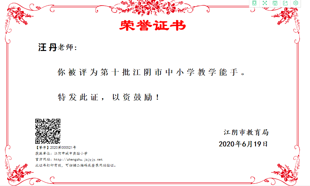 缪宏敏名师工作室成员汪丹老师被评为江阴市第十批中小学教学能手