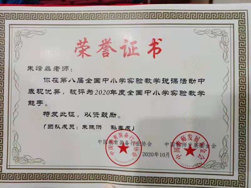 孙春成老师指导的江阴市华西实验学校朱峰磊老师获评全国实验教学能手。