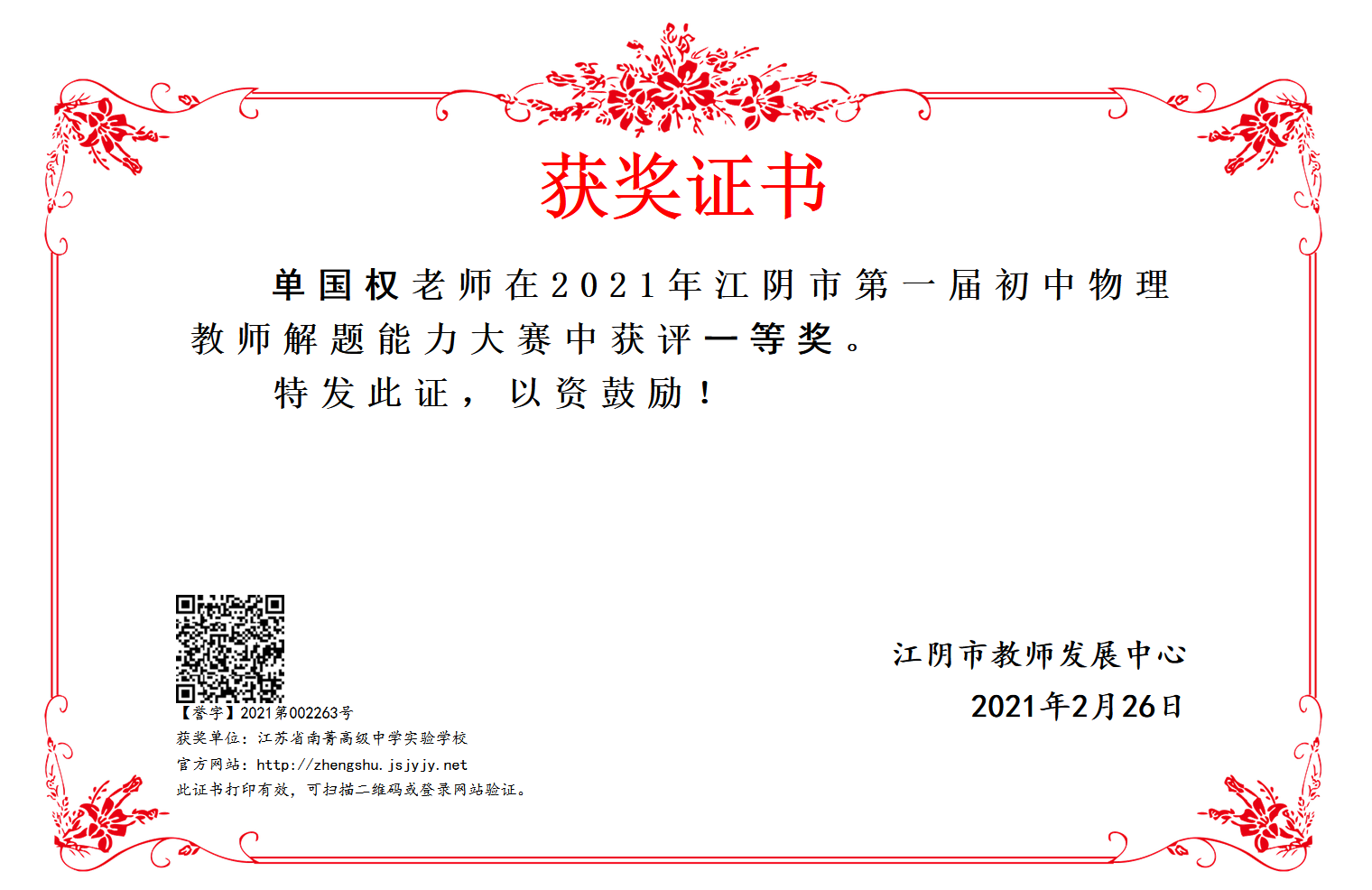 工作室学员单国权柳怡等老师获解题能力大赛一等奖