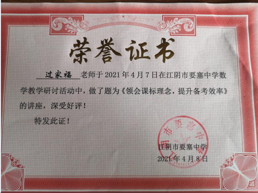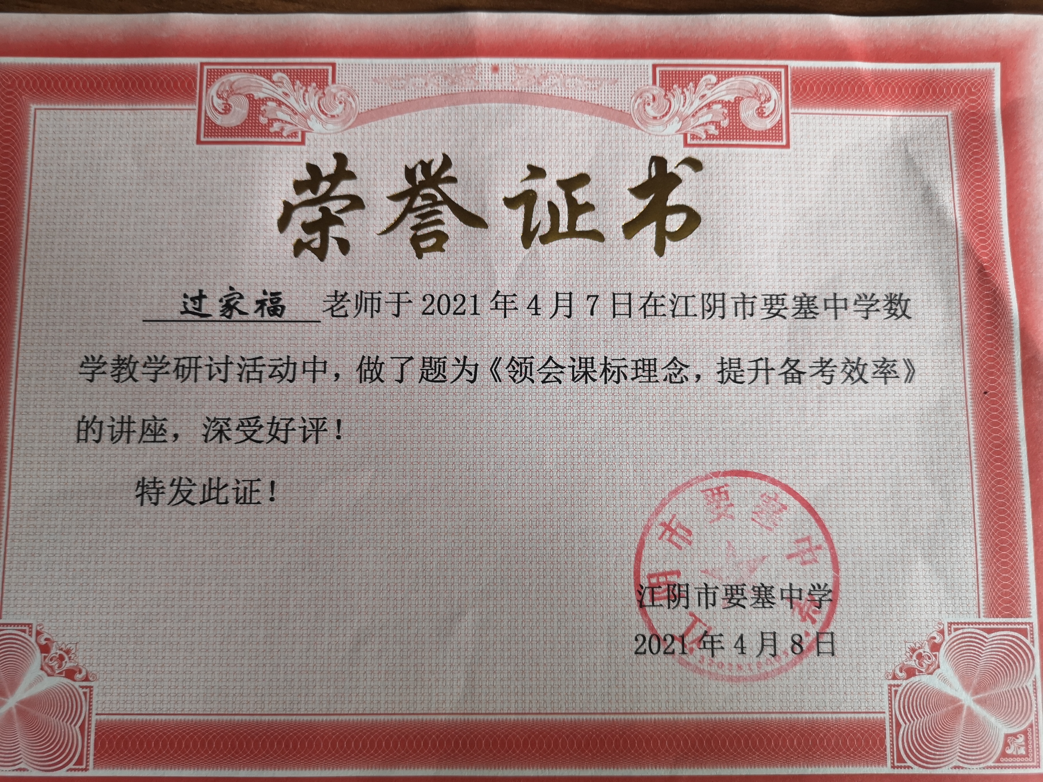 过家福老师应邀参加江阴市要塞中学教学研讨活动,并作了题为《领会新课标理念,提升备考效率》的专题讲座,获一致好评。