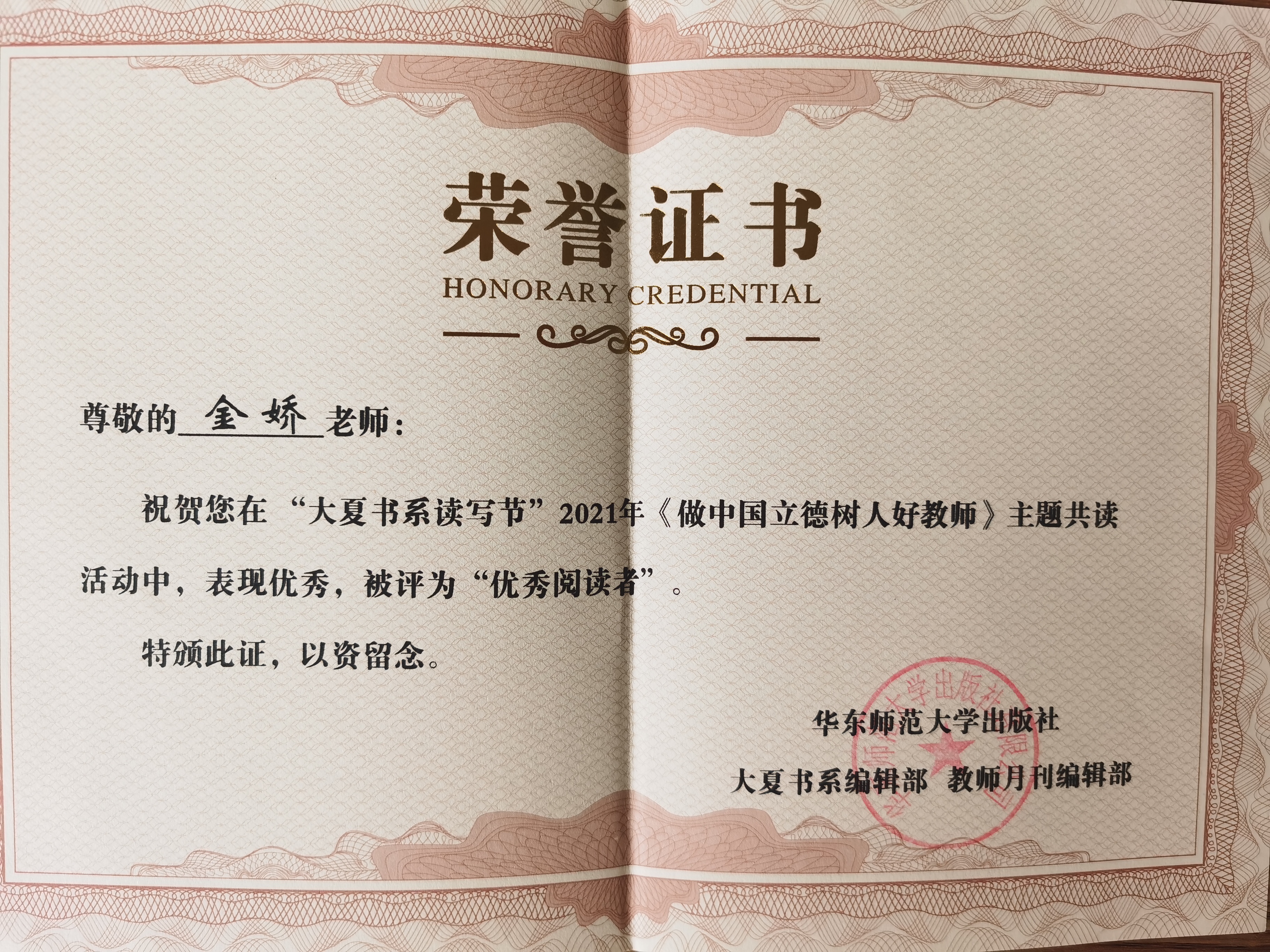 金娇老师在“大夏书系读书节“2021年《做中国立德树人好教师》主题共读中,被评为“优秀阅读者”
