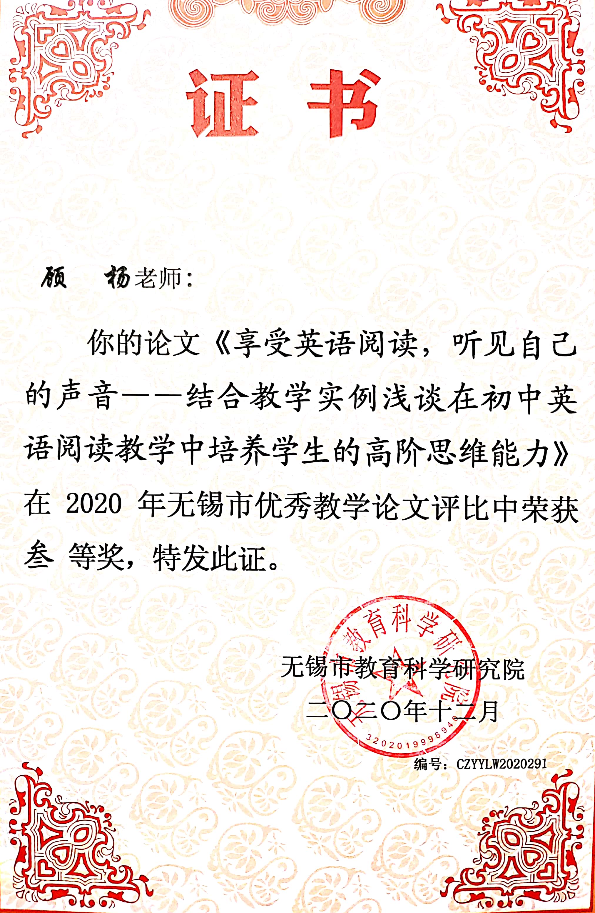 顾杨老师的论文《享受英语阅读,听见自己的声音》获得无锡市优秀教学论文三等奖