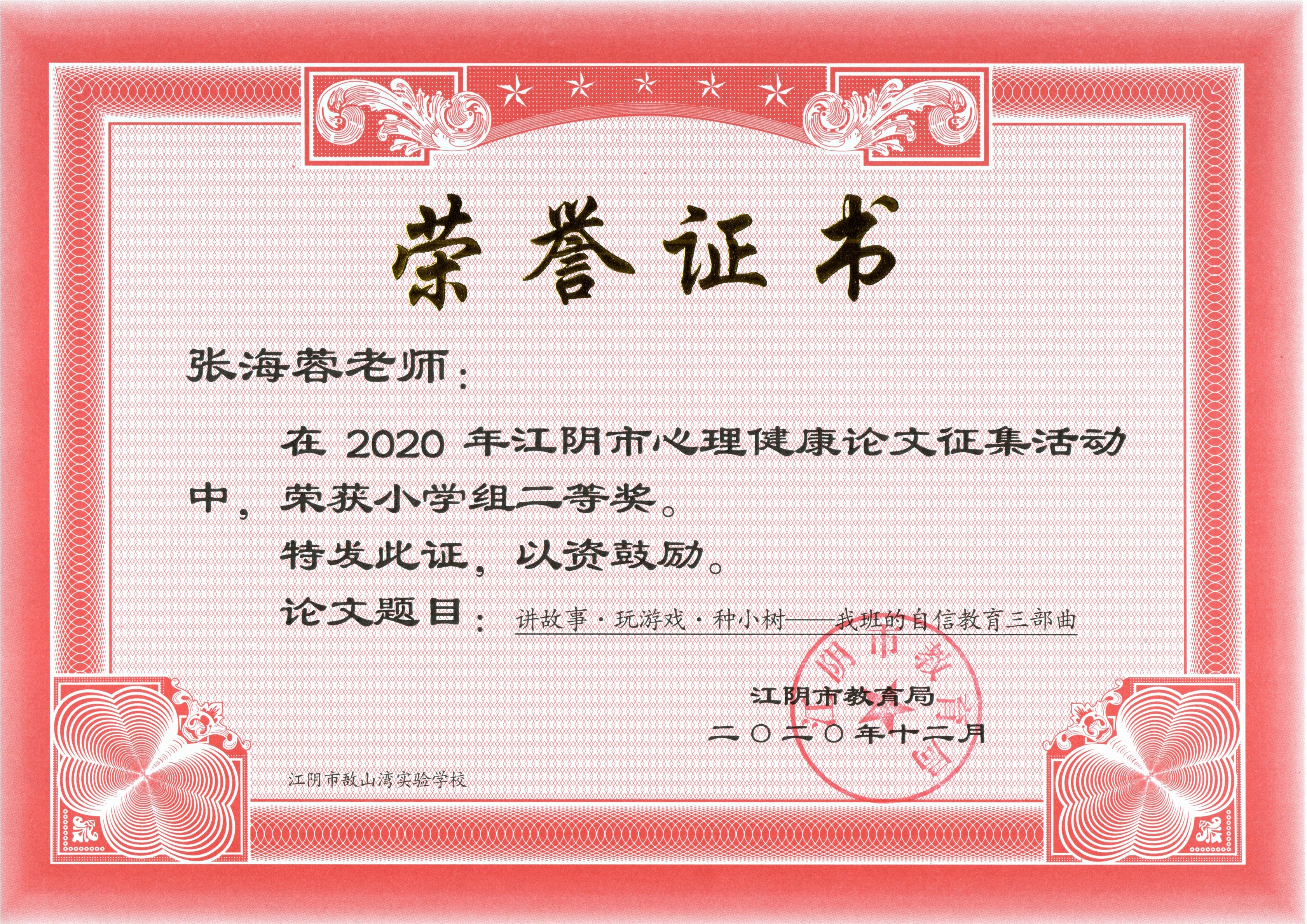 余家宇名师工作室成员张海蓉老师获得江阴市心理健康论文二等奖