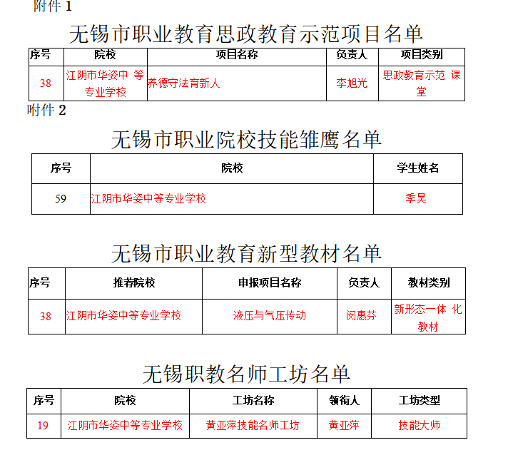 经过各地学校申报,无锡市教育局组织专家进行评审,认定一批重点项目,其中包括20个无锡市职教名师工坊,100名无锡市职业院校技能雏鹰,华姿中专校《黄亚萍技能名师工坊》通过名师工坊评审和认定。黄亚萍老师指导的技能竞赛省赛金牌选手季昊,获得“技能雏鹰”称号。