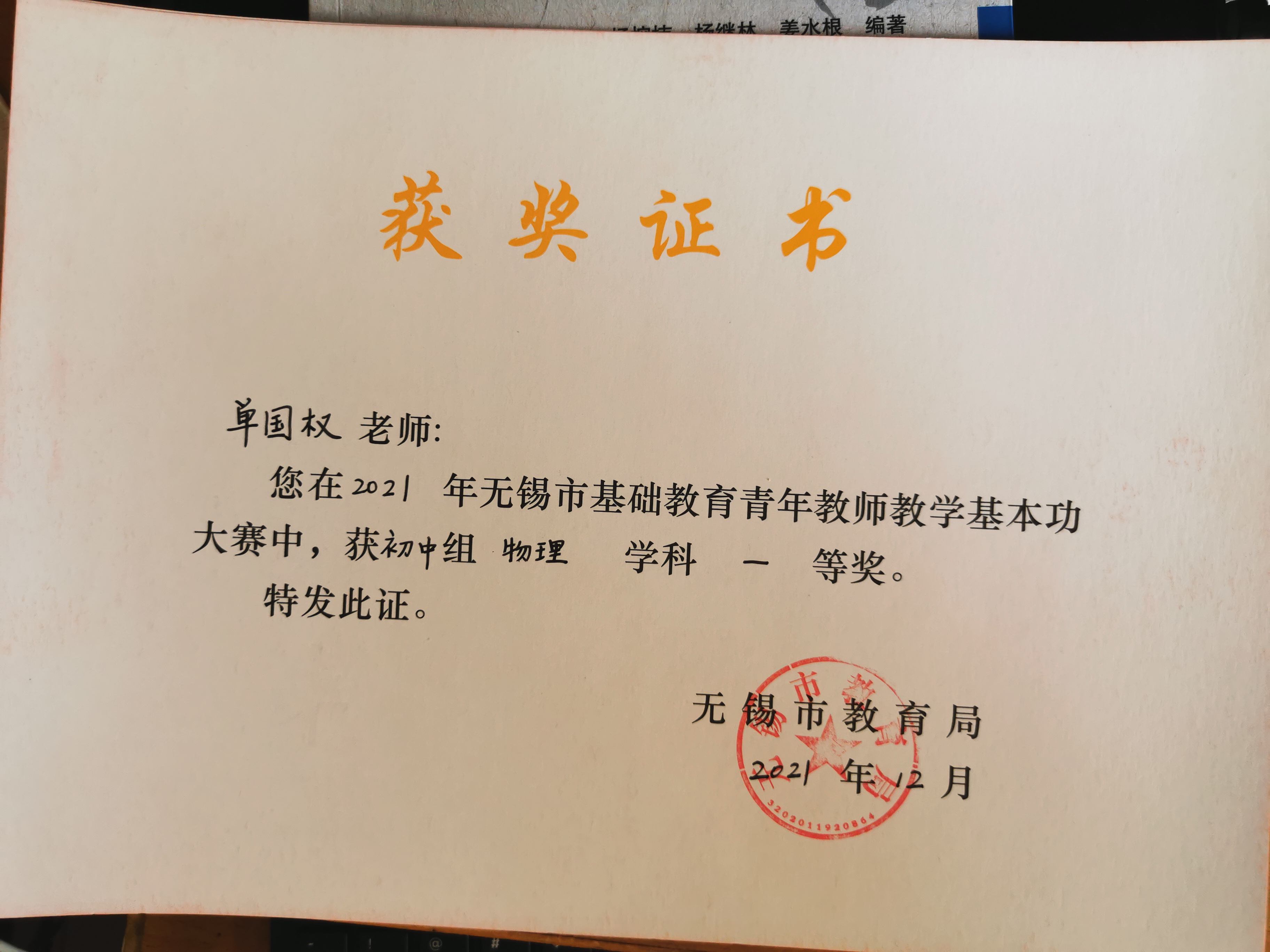 朱峰磊基本功大赛无锡市一等奖证书