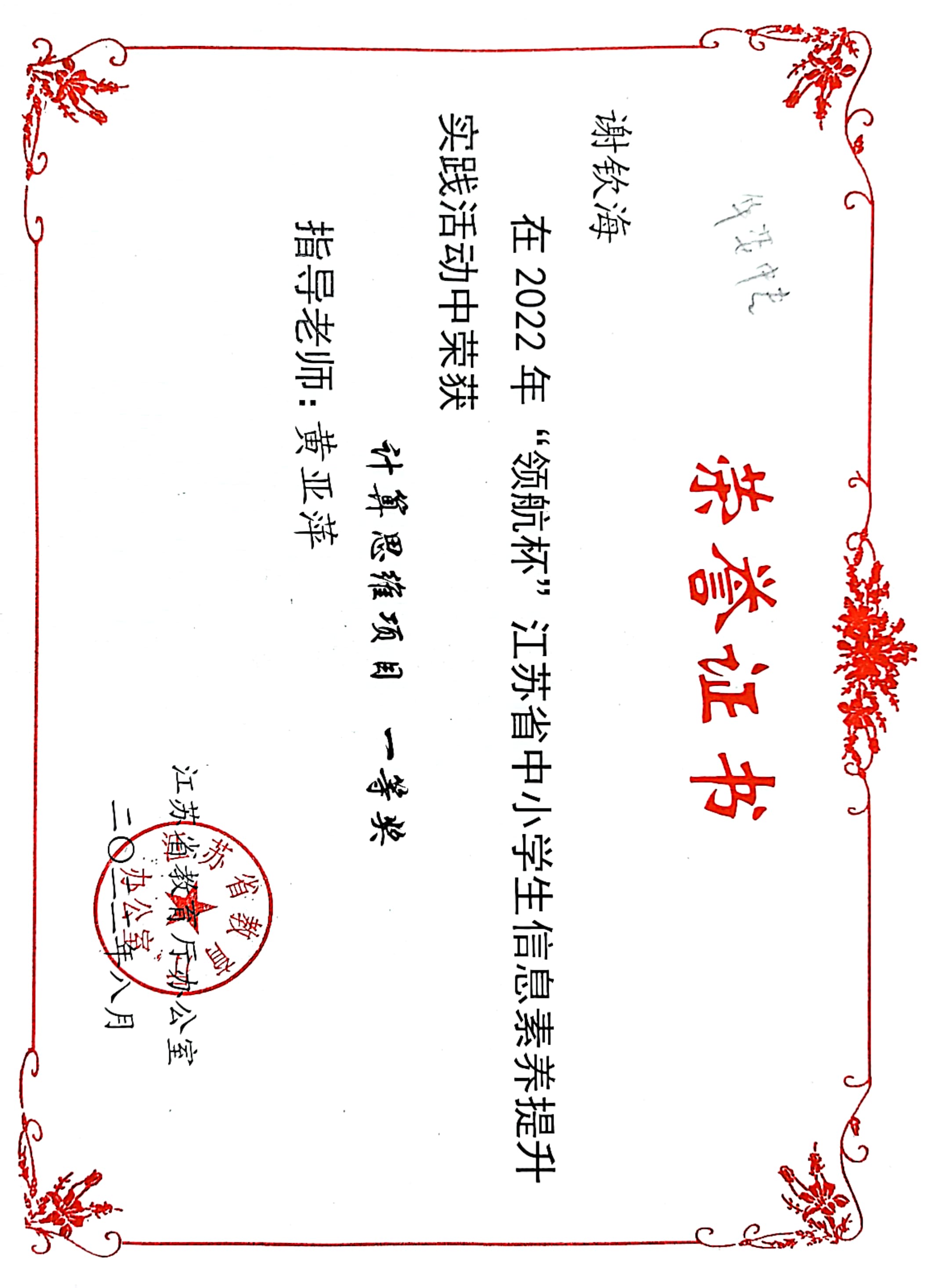 黄亚萍老师指导谢钦海同学获2022“领航杯”江苏省中小学信息素养提升实践活动创新开发组一等奖