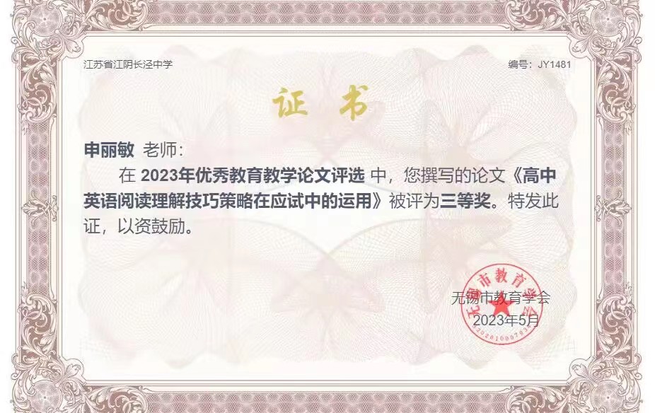 所在单位:江苏省江阴长泾中学